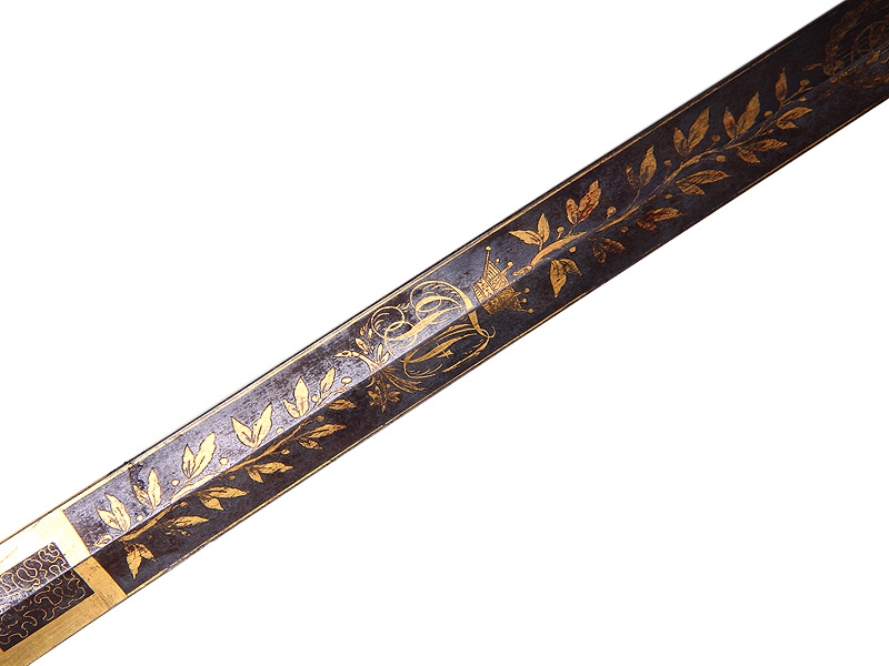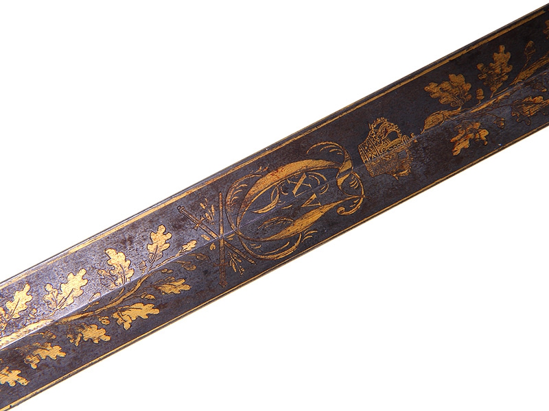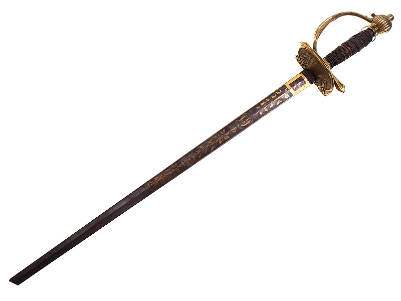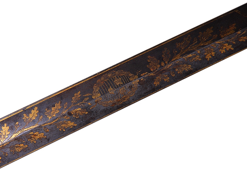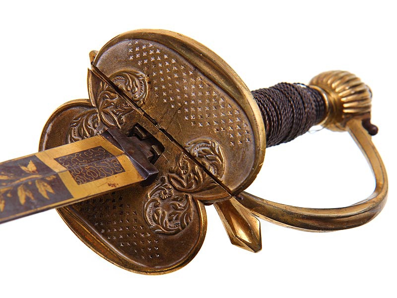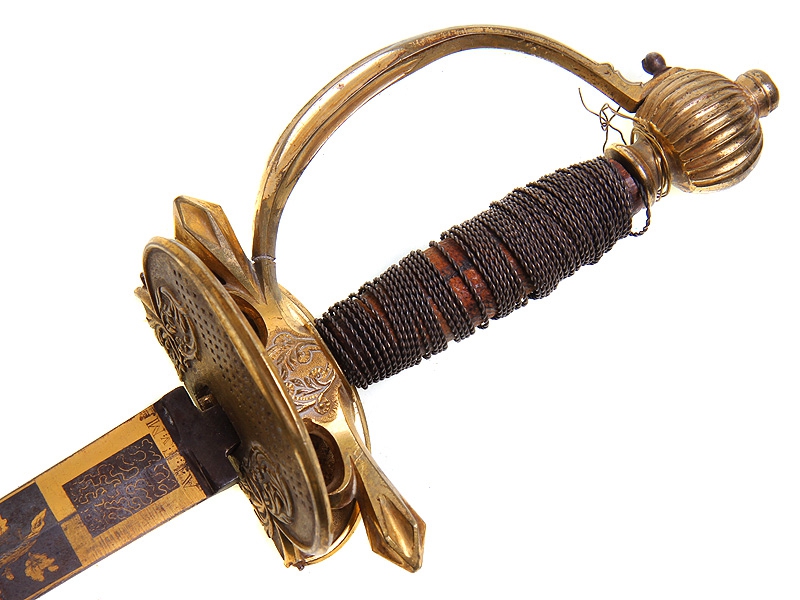 Пехотная офицерская шпага второй четверти XIX века. Клинок без клейм, украшен травленым позолоченным растительным орнаментом. У основания клинка - подпись мастера "AIFvM". Кончик клинка обломан. Рукоять из дерева, обмотана витой латунной проволокой, прибор рукояти латунный вызолоченный. Золочение отлично сохранилось. Ножны отсутствуют.