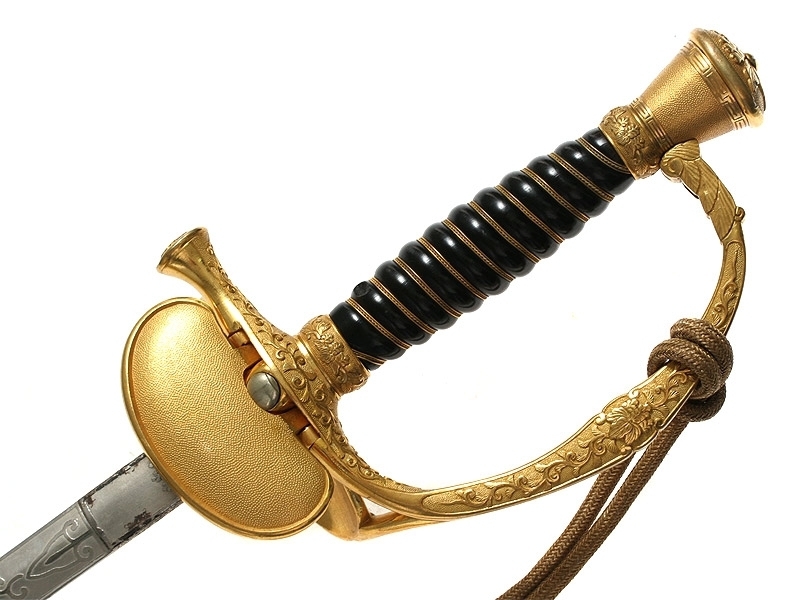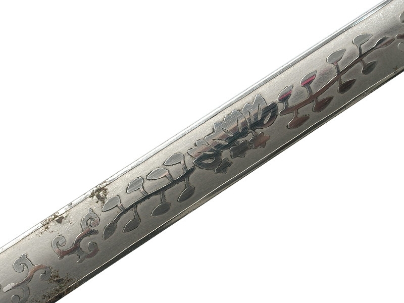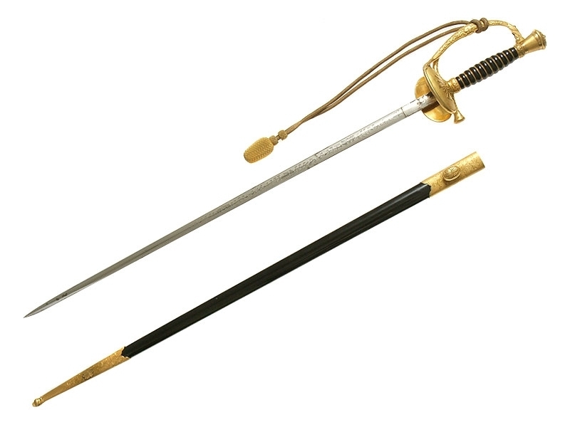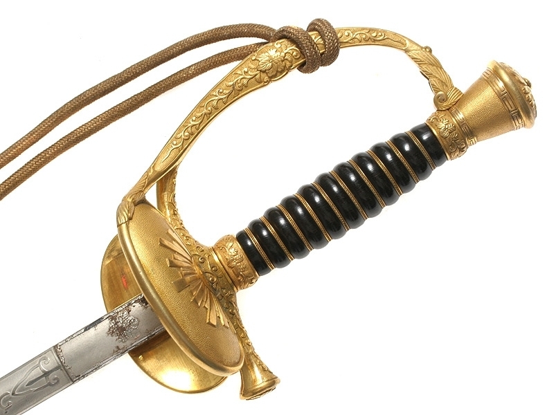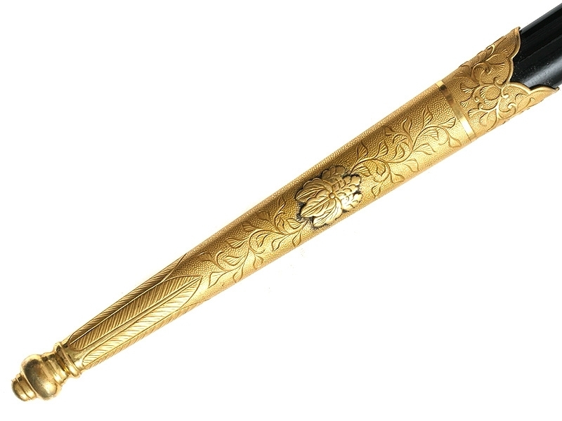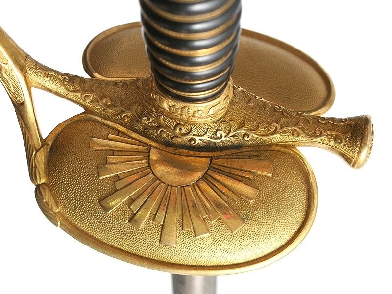 Уникально редкий образец шпаги придворных чинов, изготовленной около 1876 года. Клинок никелированный, украшен травлеными гербами павлонии. Рукоять из черного рога, с латунным прибором, покрытым ярким огненным золочением. На чашке гарды помещено изображение восходящего солнца, с внутренней стороны чашка гарды изготовлена складной для удобства ношения. Ножны деревянные, покрытые черным лаком; прибор превосходно проработан и позолочен. На дужке гарды, устье и наконечнике ножен помещены императорские гербы павлонии. Сохранился оригинальный темляк из металлизированной золотистой нити.