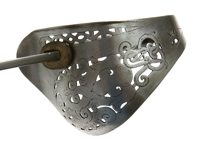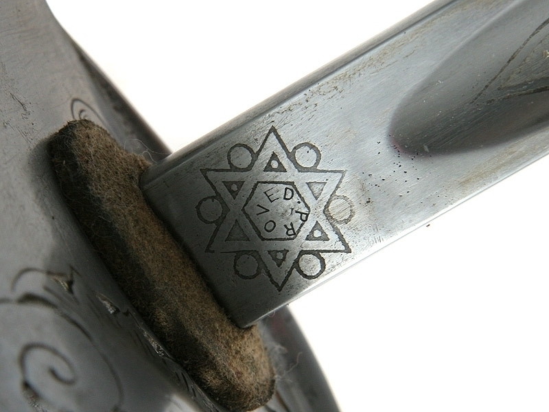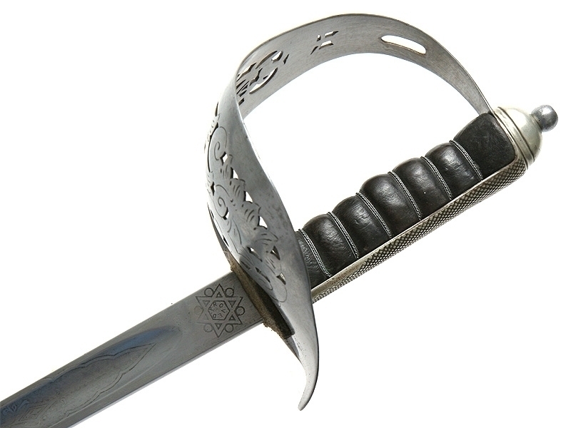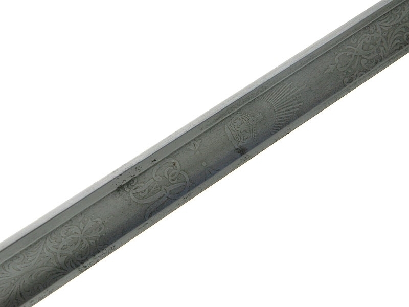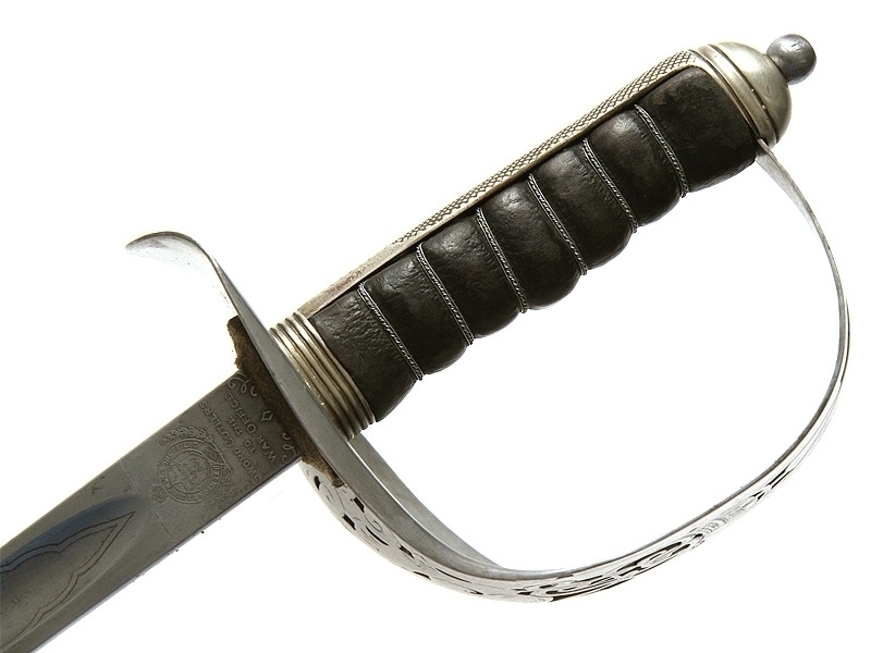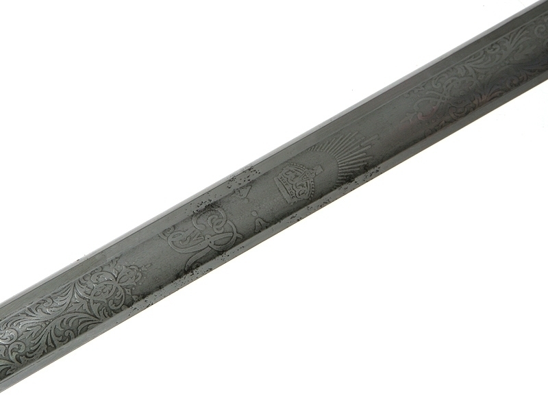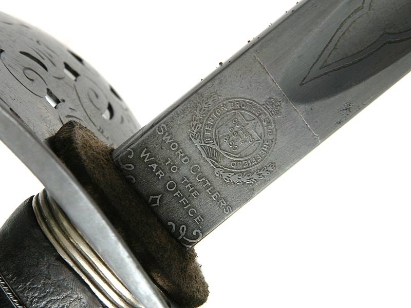 Унтер-офицерская шпага образца 1897 года в очень хорошем состоянии. Клинок прямой, с одним долом в верхней половине. У пяты клинка с внутренней стороны клеймо: "Sword Cutlers to the War Office", над ним круглый штамп производителя с надписью в центре "Cutlers Est-d 1850" и по кругу "Fenton Brothers Ltd Sheffield", с внешней сторны поверочное клеймо "Proved" в шестиконечной звезде. Клинок до середины украшен травленым растительным орнаментом, вензелем короля Георга V под королевской короной. Рукоять обтянута кожей, перевитой по желобкам проволокой. Прибор рукояти стальной, чашка гарды украшена прорезным королевским вензелем. Ножны деревянные, обтянутые коричневой кожей.