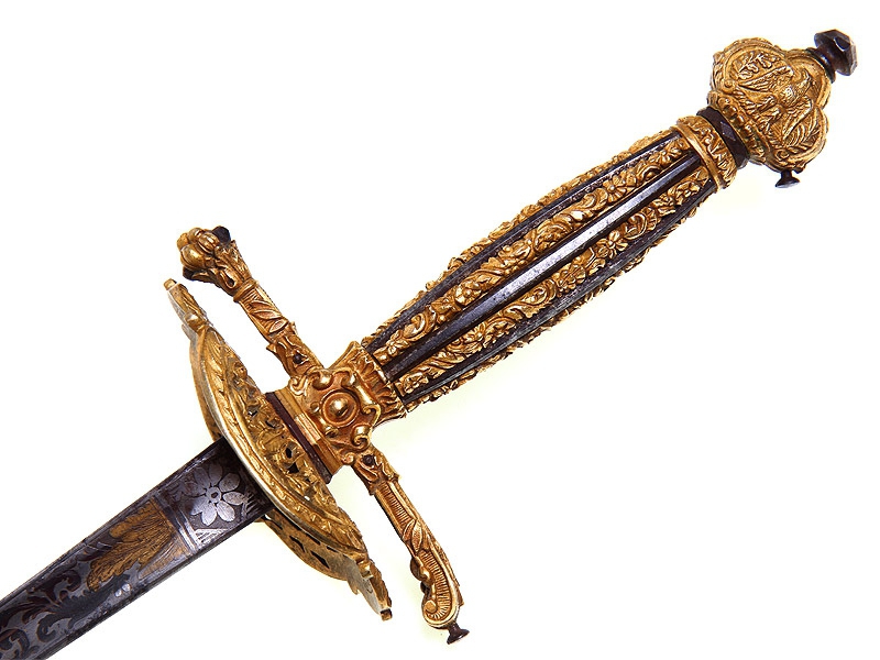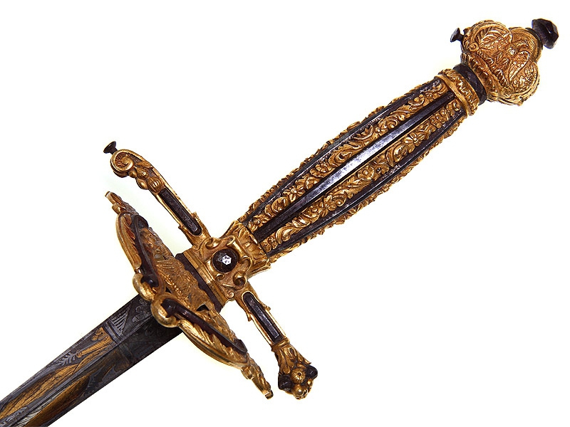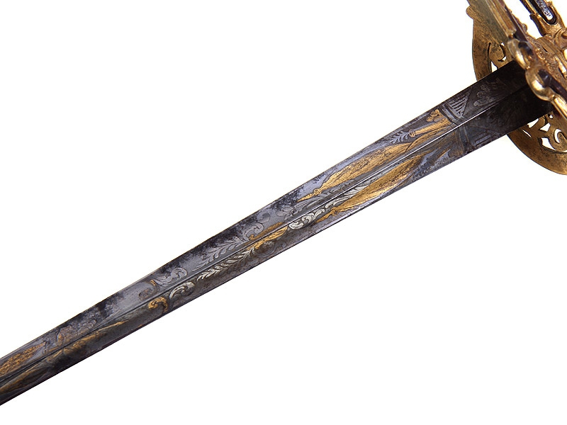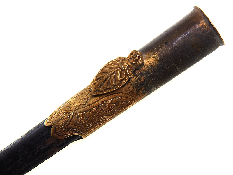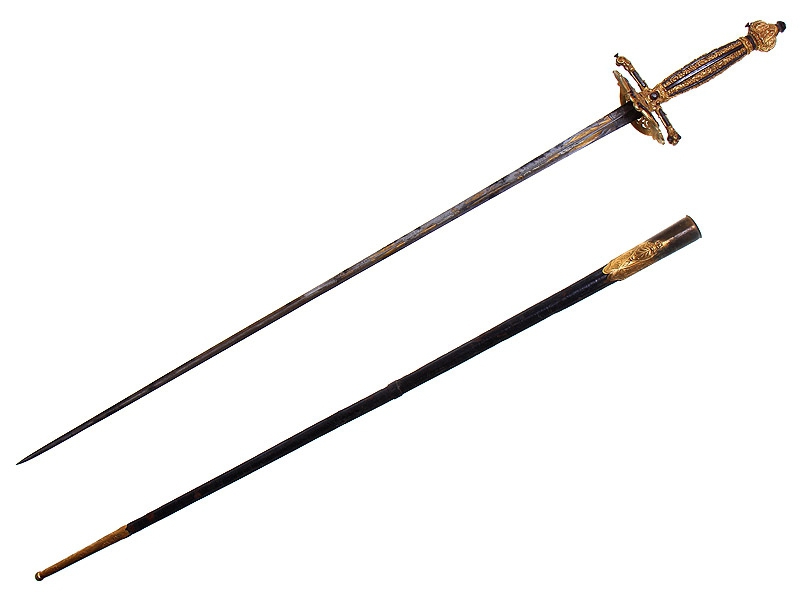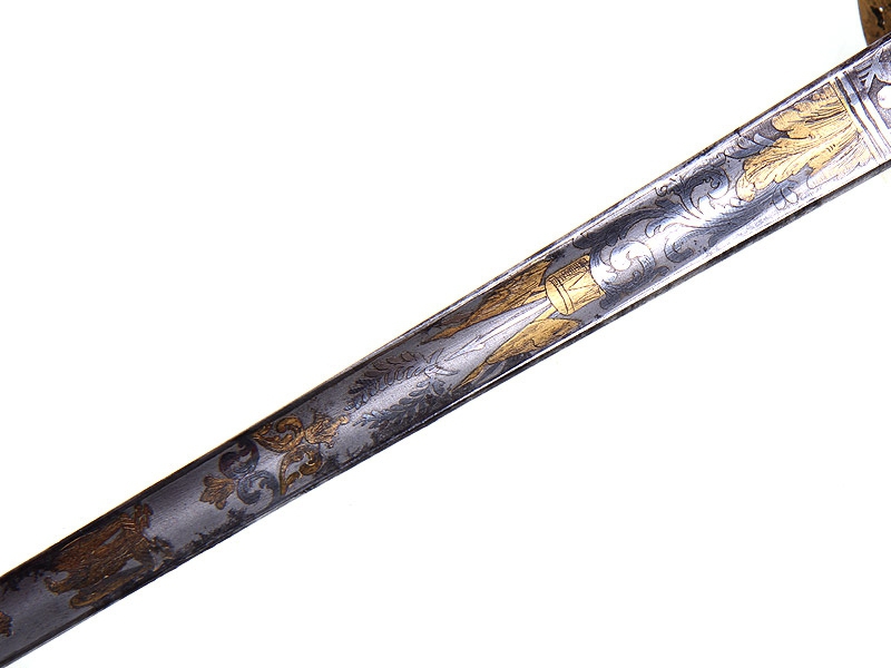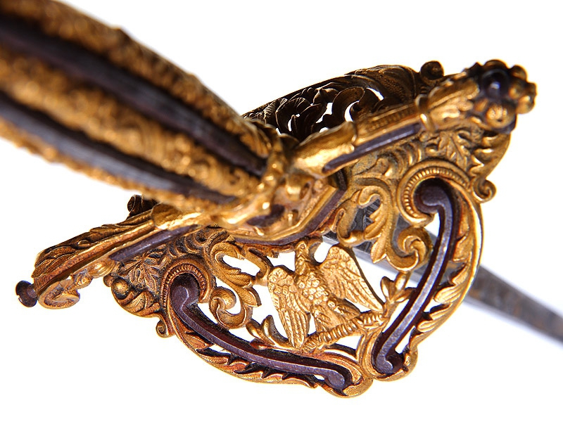 Шпага военного чиновника периода Республики. Клинок без клейм, украшен травленым золоченым декором. Все части рукояти изготовлены из золоченой бронзы, со стальными элементами, имеющими "алмазную" огранку. На чашке - прорезное изображение орла. Практически полностью сохранилось золочение. Ножны кожаные, с золоченым бронзовым прибором.