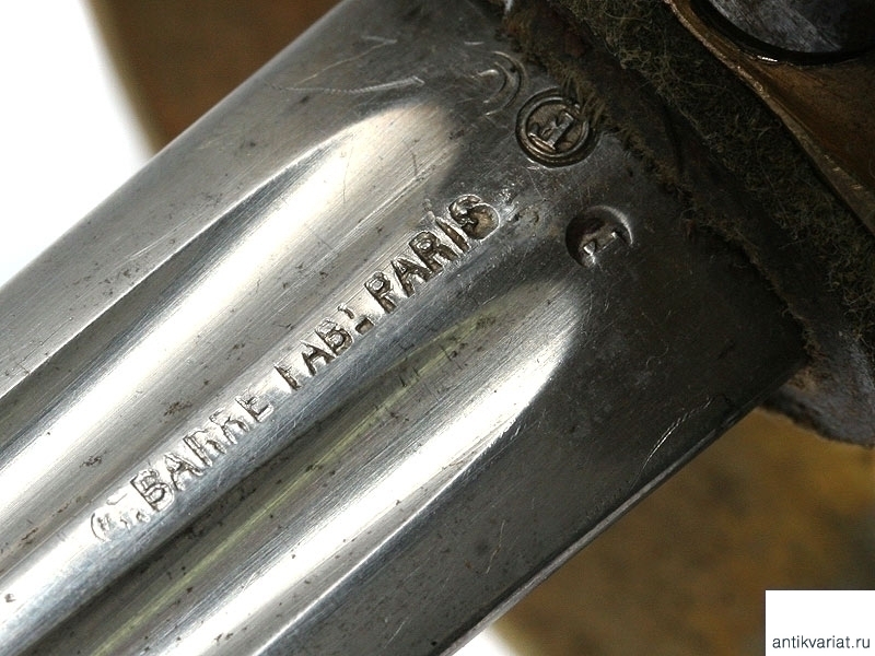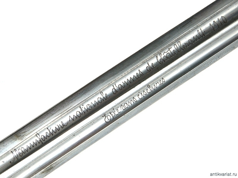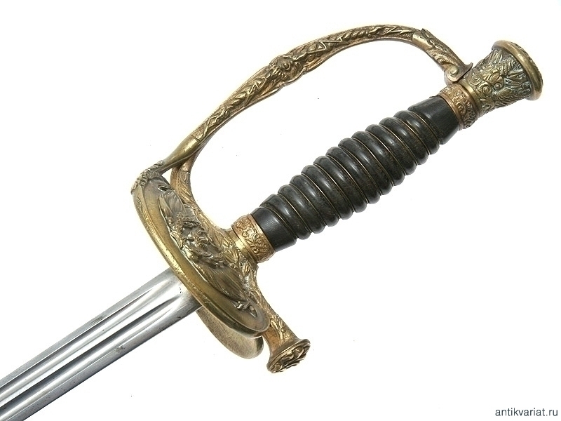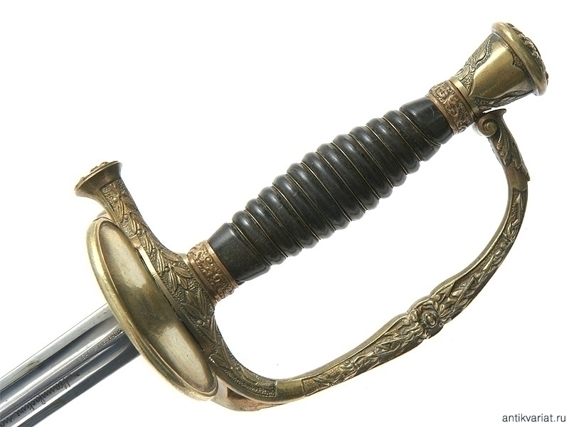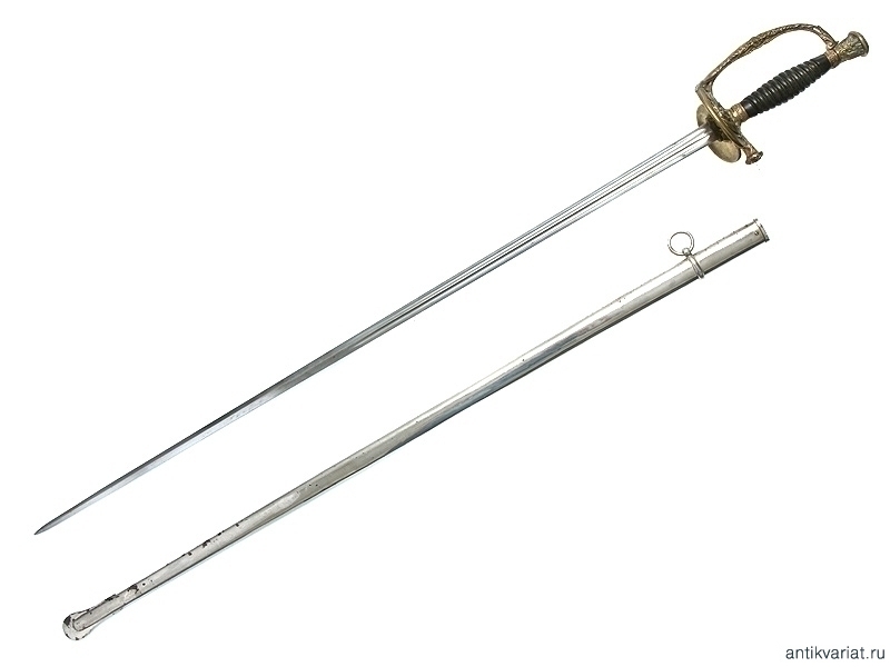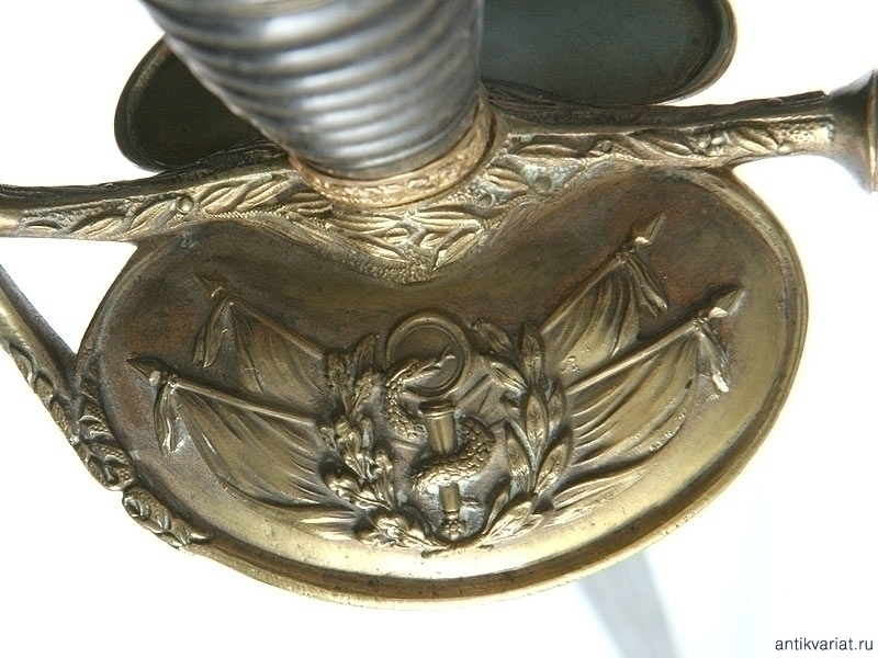 Шпага военного медика в очень хорошей сохранности. Клинок с нанесенной травлением надписью, датирован 1910 годом. Рукоять роговая. Металлический прибор изготовлен из позолоченной бронзы. Чашка гарды украшена медицинской эмблемой в окружении знамен. Ножны никелированные.