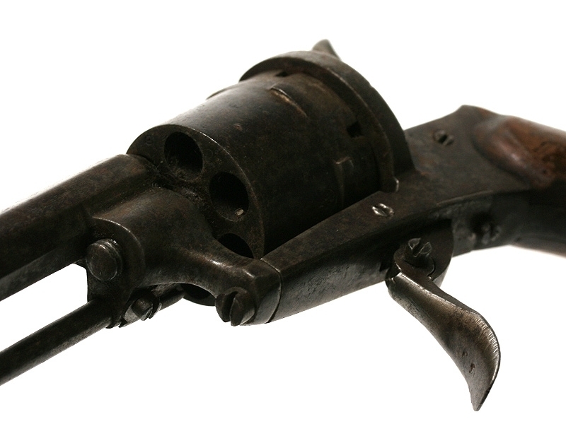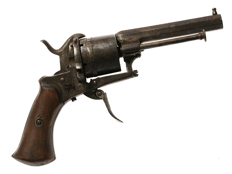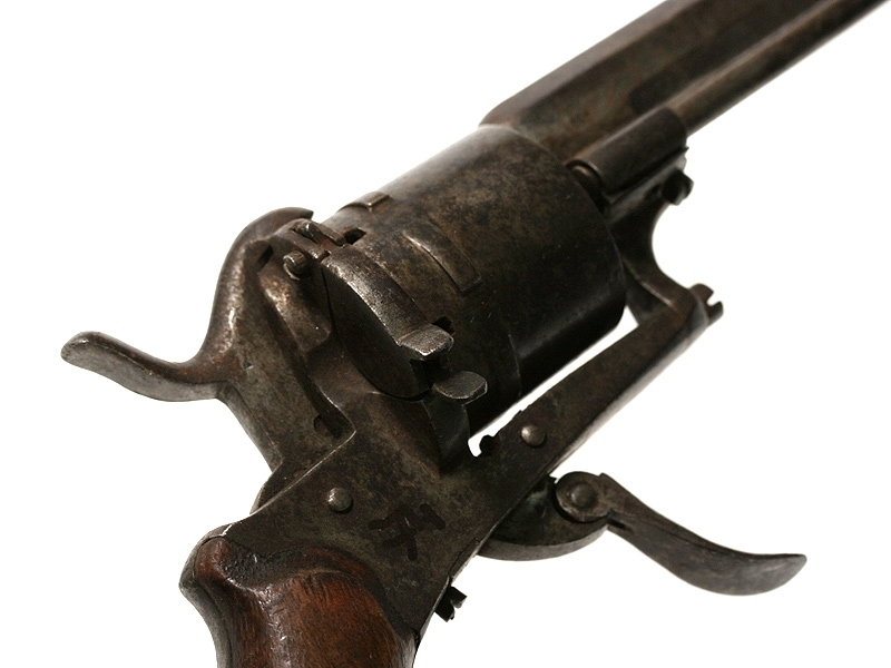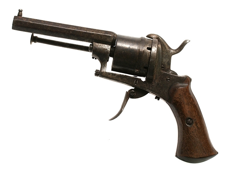Шестизарядный шпилечный револьвер системы Лефоше середины XIX века. Карманная модель, спусковой крючок сделан складным для удобства ношения, на барабане имеется клеймо мануфактуры в Льеже.