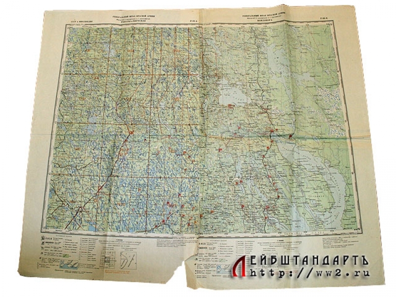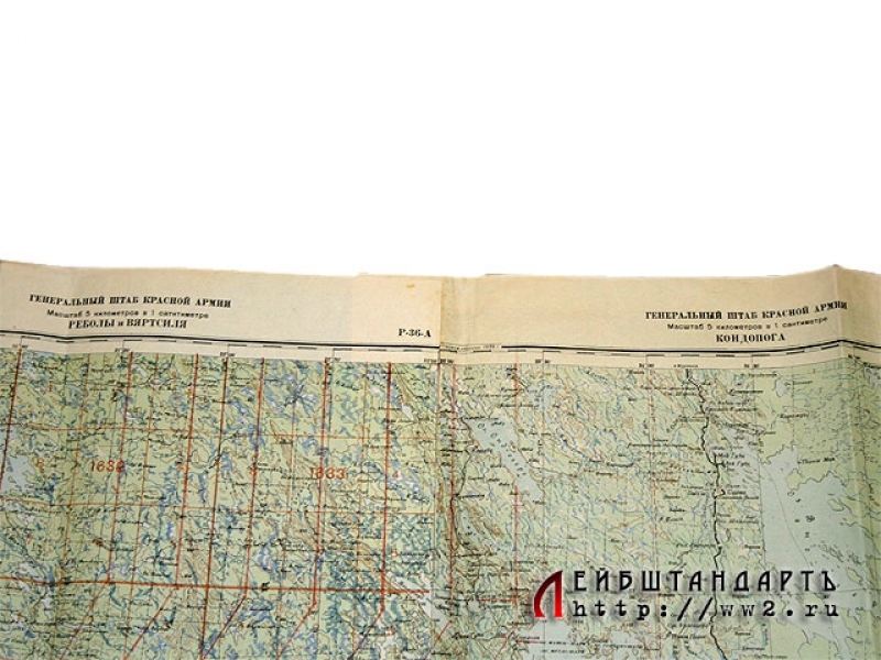 Штабная карта, изданная Генеральным штабом РККА в 1940 году. Изображены финские районы Реболы, Вяртсиля и Кондопога в масштабе 5 километров в 1 сантиметре. На карте множество карандашных пометок - красных флажков, обозначающих продвижение советских войск во время Финской войны.