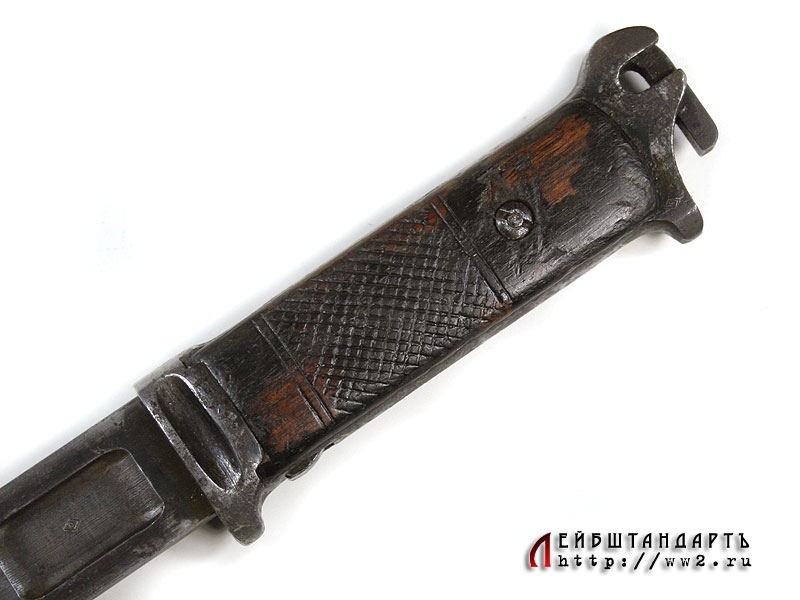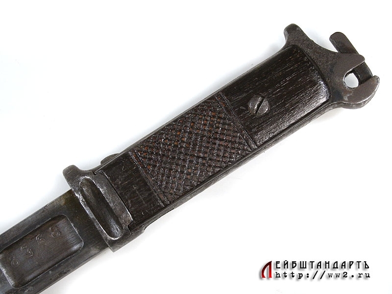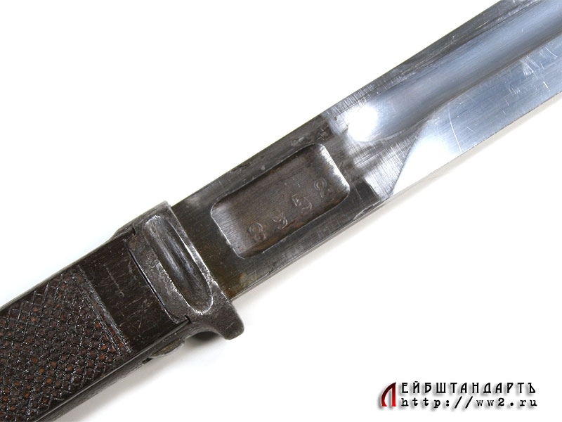 Штык к автоматической винтовке системы Симонова образца 1936 года в очень хорошем состоянии. Достаточно необычная система фиксации данного штыка на винтовочном стволе: рукоять представляет собой подвижную вдоль хвостовика рамку с пружиной внутри и двумя деревянными щечками, которая сдвигается вниз к острию клинка. На клинке номер: "8952".