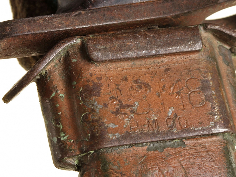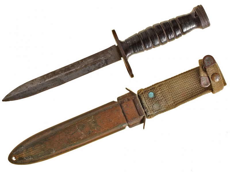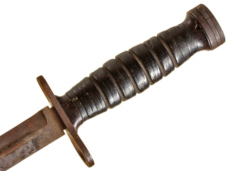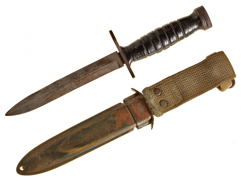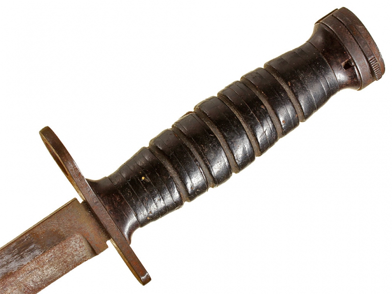 Штык к самозарядному карабину М1, изготовленный в годы Второй мировой войны. Клинок с "полуторной" заточкой, без клейм. Рукоять наборная, из толстых кожаных пластин, с поперечными желобками. Навершие имеет две рифленые кнопки со скрытым пружинным фиксатором для крепления к приливу на винтовочном стволе. Гарда прямая, с клеймом изготовителя "U.S. M4 CAMILLUS" и клеймом в виде пылающей гренады. Ножны пластиковые, с брезентовым подвесом.