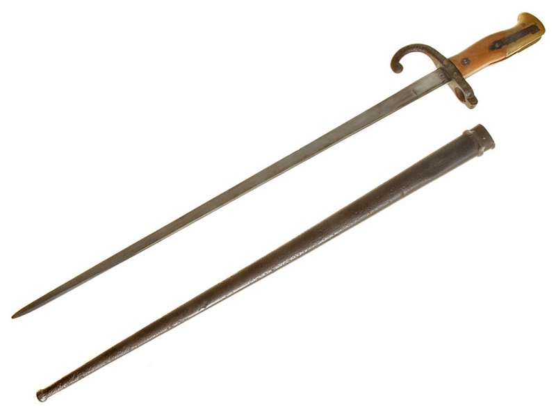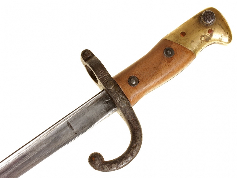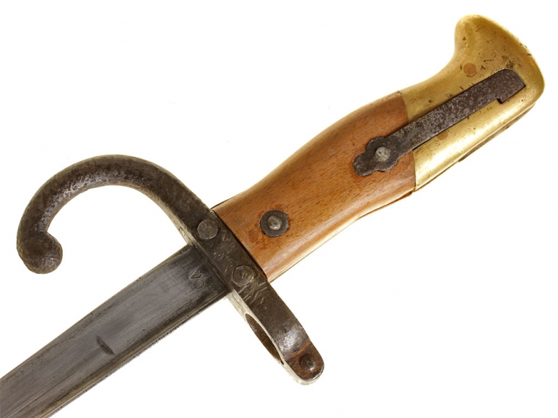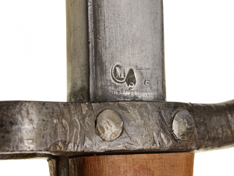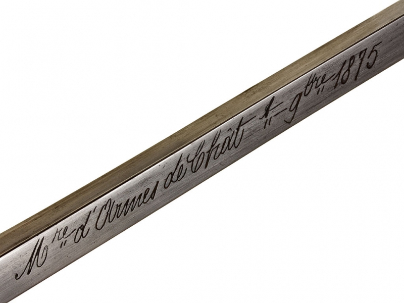 Клинок стальной однолезвийный, Т-образного сечения; на обухе клинка гравированная надпись, свидетельствующая о производстве арсеналом в Шательро в 1875 году.