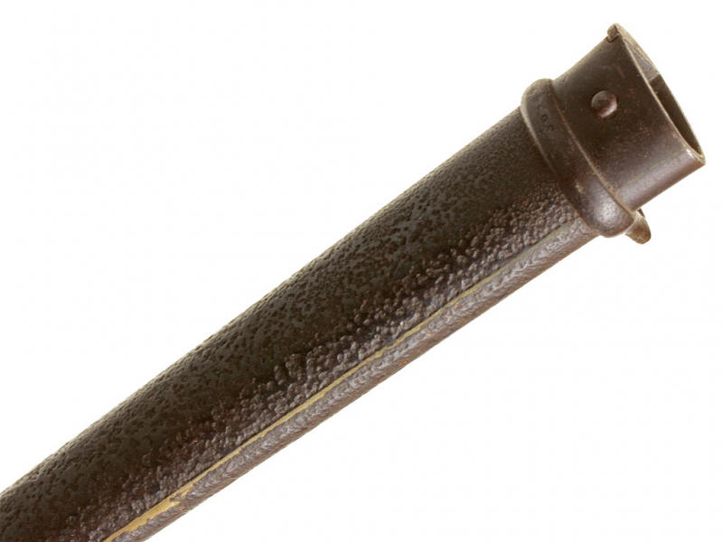 Рукоять с волнистой спинкой образована двумя деревянными щечками (реставрированы), скрепленными с хвостовиком клинка двумя заклепками. В латунной головке Т-образный паз и пружинная защелка. Крестовина стальная, с загнутым вниз каплевидным концом в виде шарика и кольцом для ствола со стороны обуха клинка. Лапки крестовины, образующие кольцо, скреплены клепкой. Ножны цельнометаллические, со скобой. На ножнах и гарде - поверхностные следы коррозии.