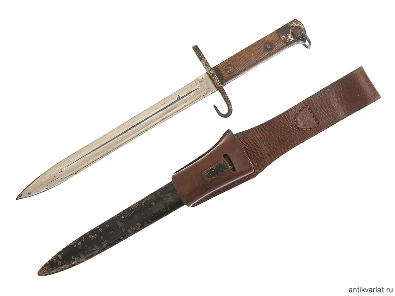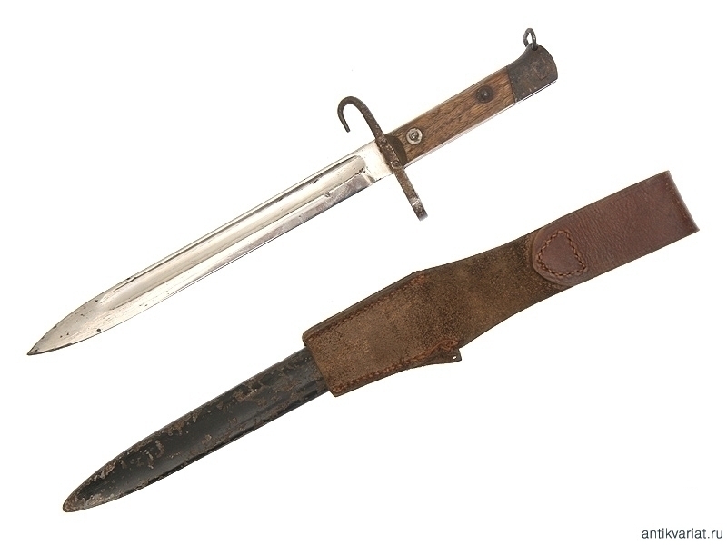 Штык к винтовке Маннлихер образца 1895 года. Офицерский вариант, отличающийся от стандартного наличием никелевого покрытия. Ножны в частично сохранившемся красочном покрытии, к штыку прилагается оригинальный кожаный подвес.