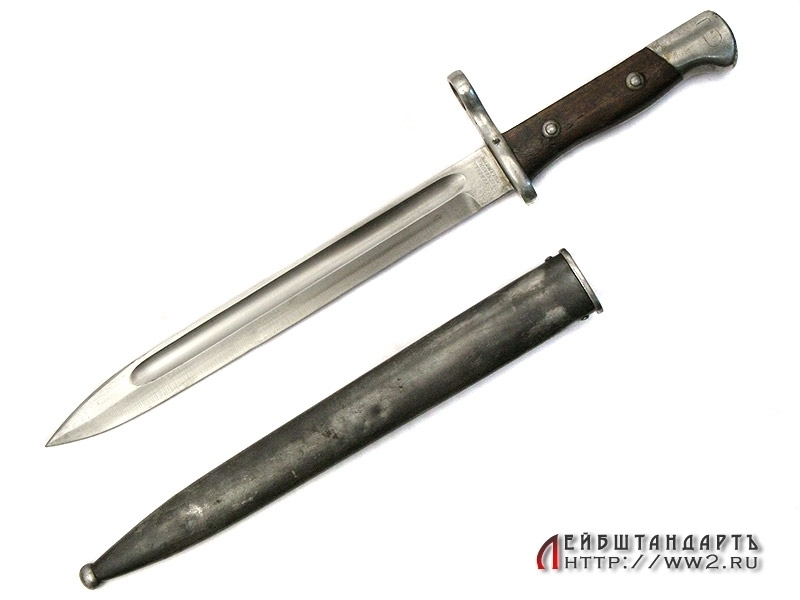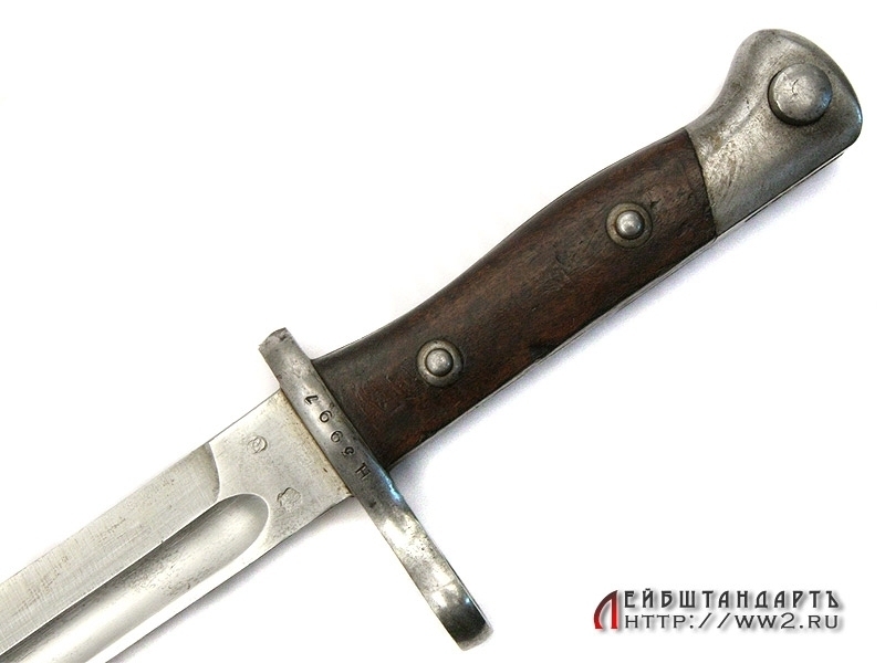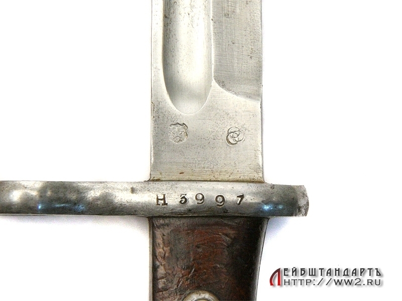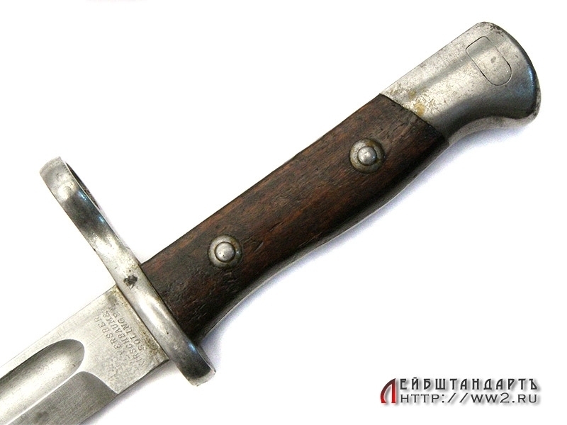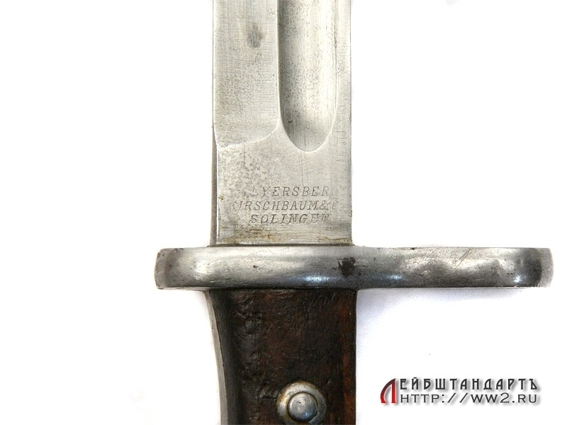 Штык-нож к винтовке Маузер М1871/84 в очень хорошем состоянии, почти без следов износа. Клеймо на клинке принадлежит фирме "Weyersberg" в Золингене. Клинок в очень хорошем состоянии. Ореховые накладки на рукояти также оригинальные. Фиксатор в рабочем состоянии. Ножны металлические, вороненые. Примечательно, что у основания клинка имеется клеймо японского арсенала: данный штык использовался и в японской армии.