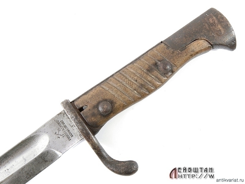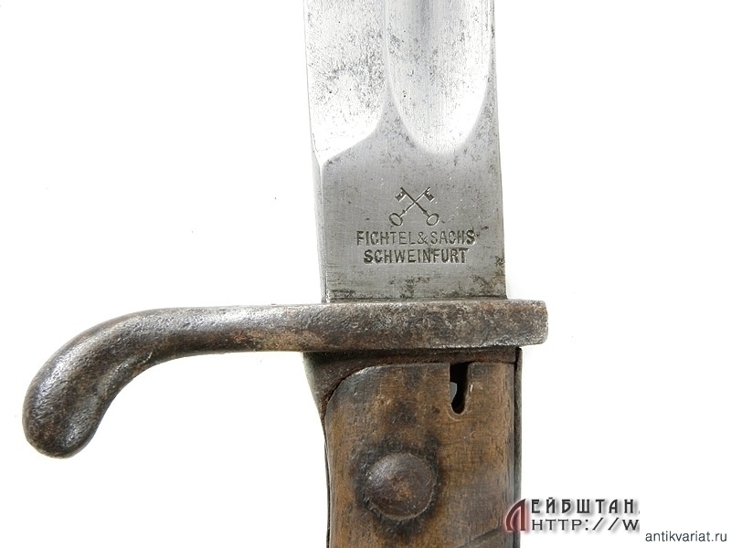 Предмет в очень хорошей сохранности, с незначительными следами износа. Клеймо на клинке - "Fichtel & Sachs Schweinfurt". На обухе проставлены приемочные клейма. Клинок в очень хорошем состоянии. Ореховые накладки на рукояти также оригинальные. Фиксатор в рабочем состоянии. Ножны стальные, в красочном покрытии.