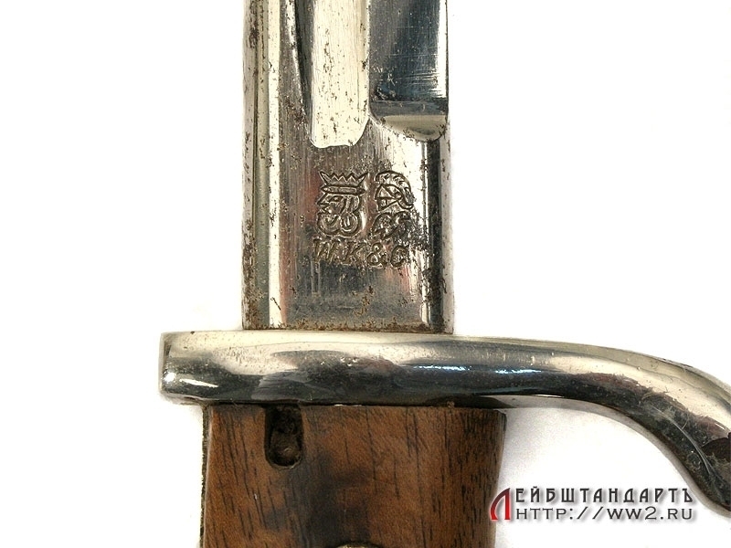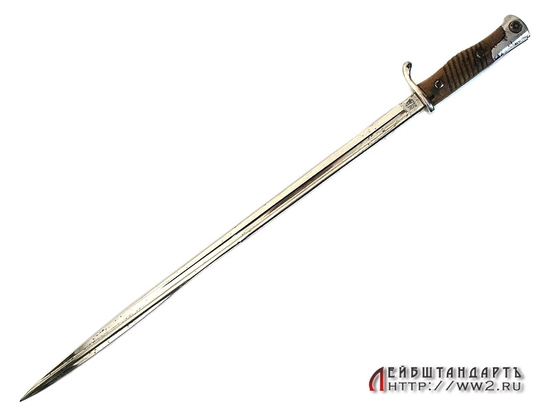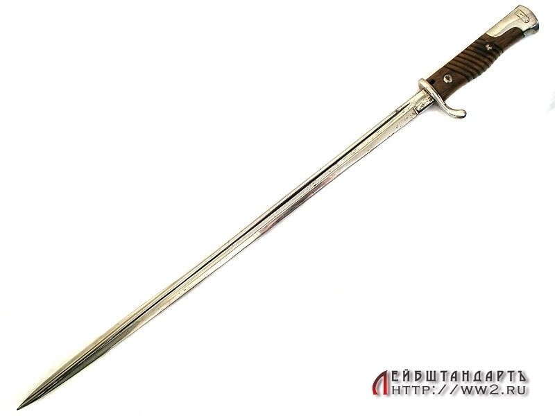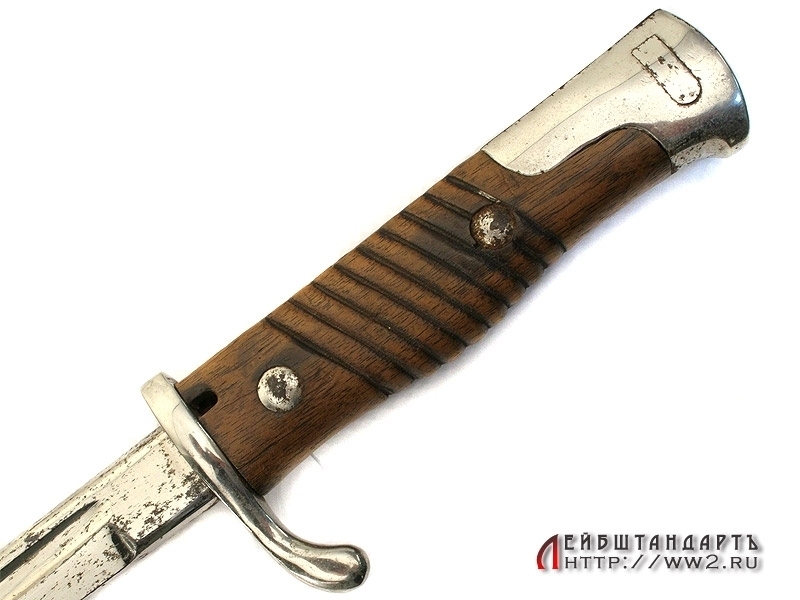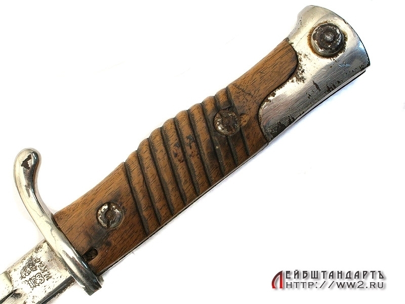 Штык к винтовке Маузер образца 1898 года в хорошей сохранности. Клеймо на клинке - фирмы "W.K&C" в Золингене. Клинок в хорошем состоянии, покрыт никелем в более позднее время. Ореховые накладки на рукояти оригинальные. Ножны отсутствуют.