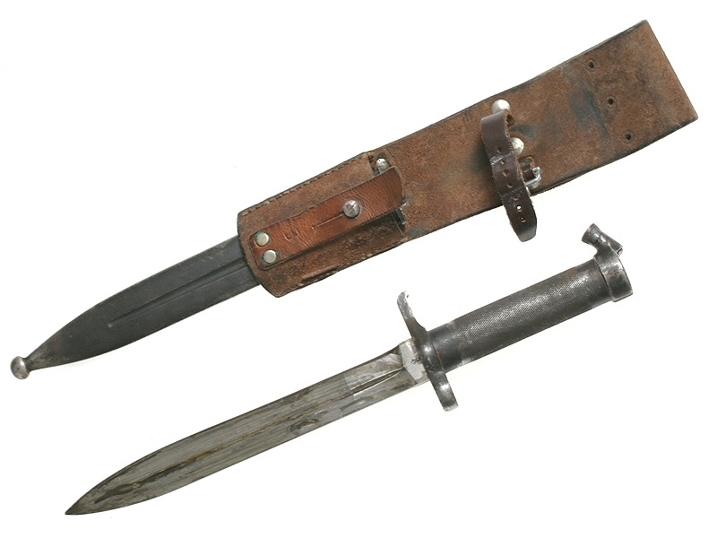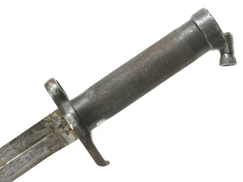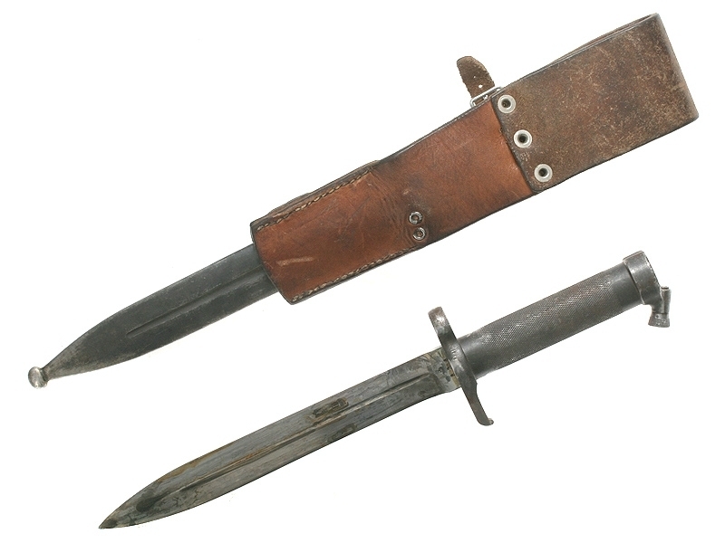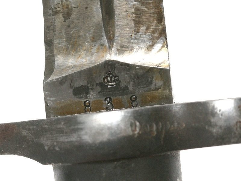 Штык к винтовке Маузер образца 1896 года. У основания клинка - клеймо в виде буквы "С" под короной и порядковый номер изделия - "838", не совпадающий с номером на устье ножен. Рукоять металлическая рифленая, ножны металлические. Сохранился оригинальный подвес с клеймом в виде буквы "В". Очень хорошее состояние.