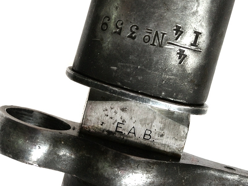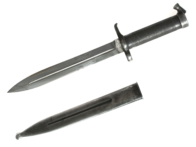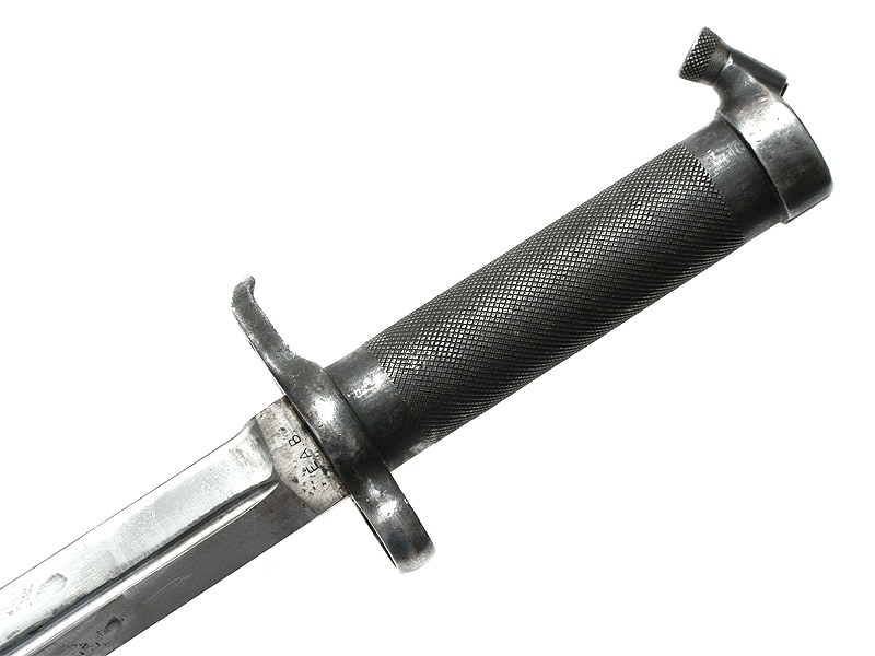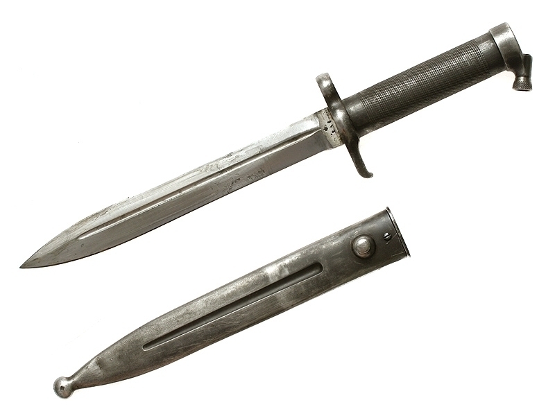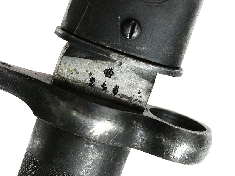 Штык к винтовке Маузер образца 1896 года. У основания клинка - клеймо в виде короны и порядковый номер изделия - "246", не совпадающий с номером на устье ножен. Рукоять металлическая рифленая, ножны металлические. Подвес не сохранился. Очень хорошее состояние.