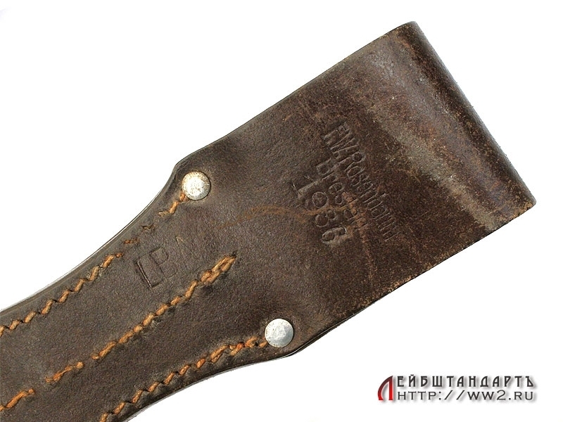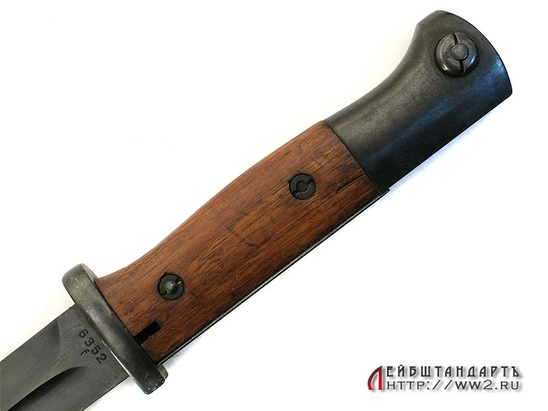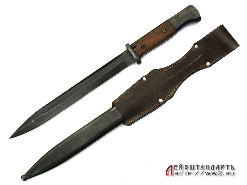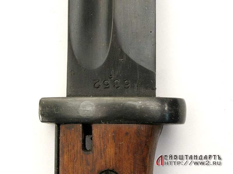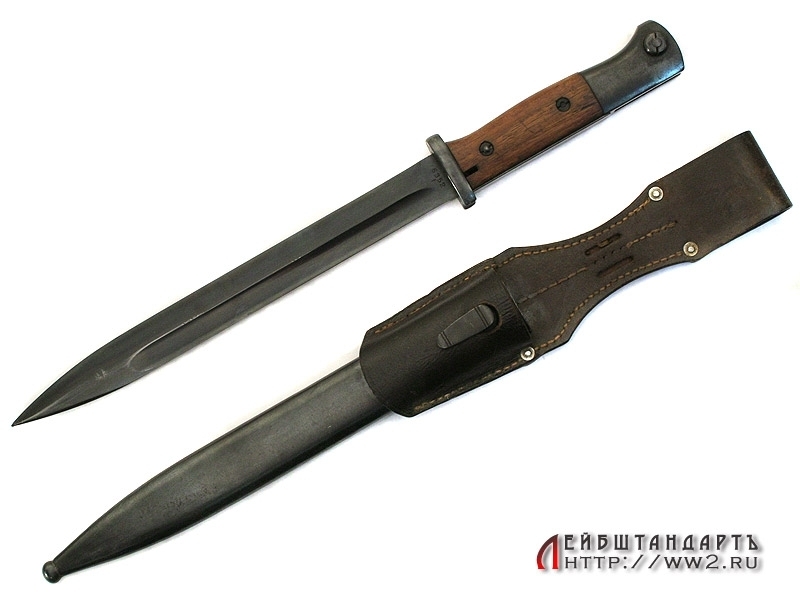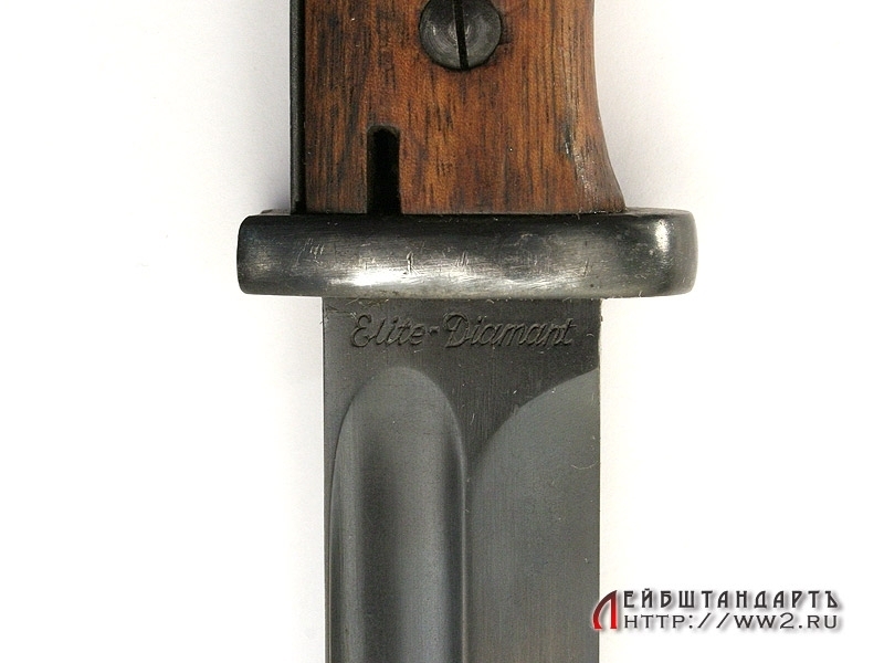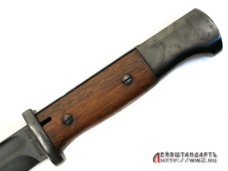 Штык к винтовке Маузера в отличном коллекционном состоянии. У основания клинка имеются крайне редкие клейма оружейной фирмы "Elite-Diamant". На оборотной стороне присутствует номер серии. Клинок полностью в оригинальном воронении. Элементы рукояти также вороненые, щечки изготовлены из дерева, предположительно ореха. На кнопке и навершии имеются клейма военной приемки в виде имперских орлов. Ножны металлические, также в полном оригинальном вороненые. Воронение сохранилось практически полностью, имеется коричневый кожаный подвес с клеймом "F.W.Rosenbaum, Breslau, 1936", приёмка L.BA. указывает, что этот штык состоял в подразделениях ВВС Люфтваффе.