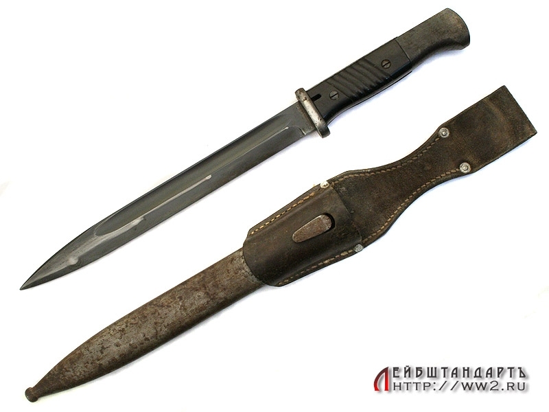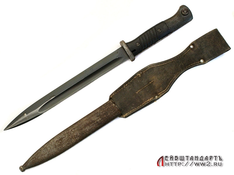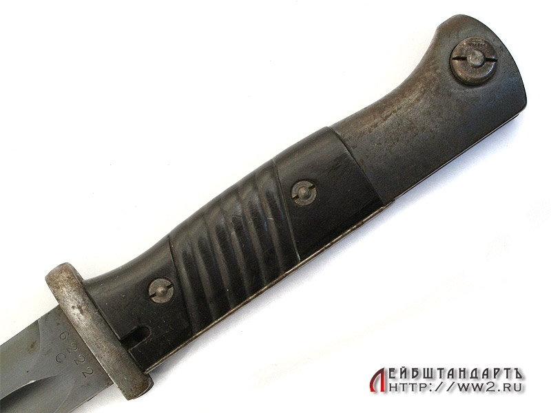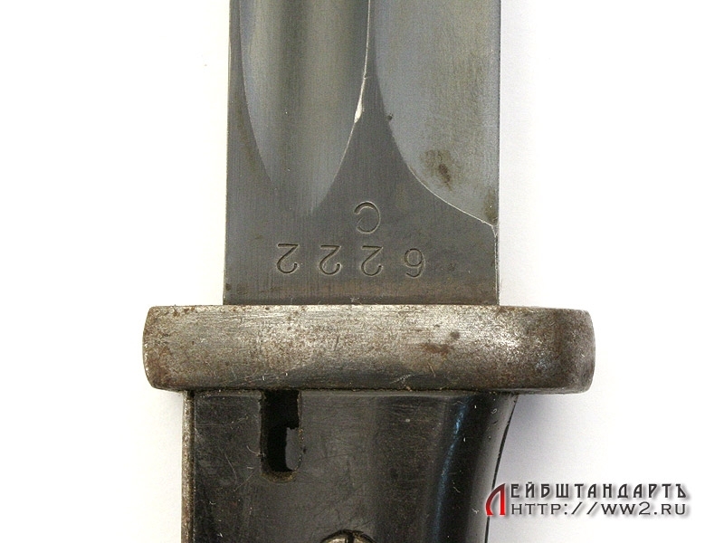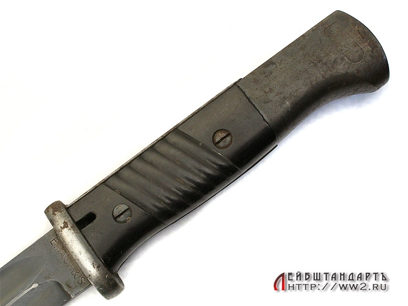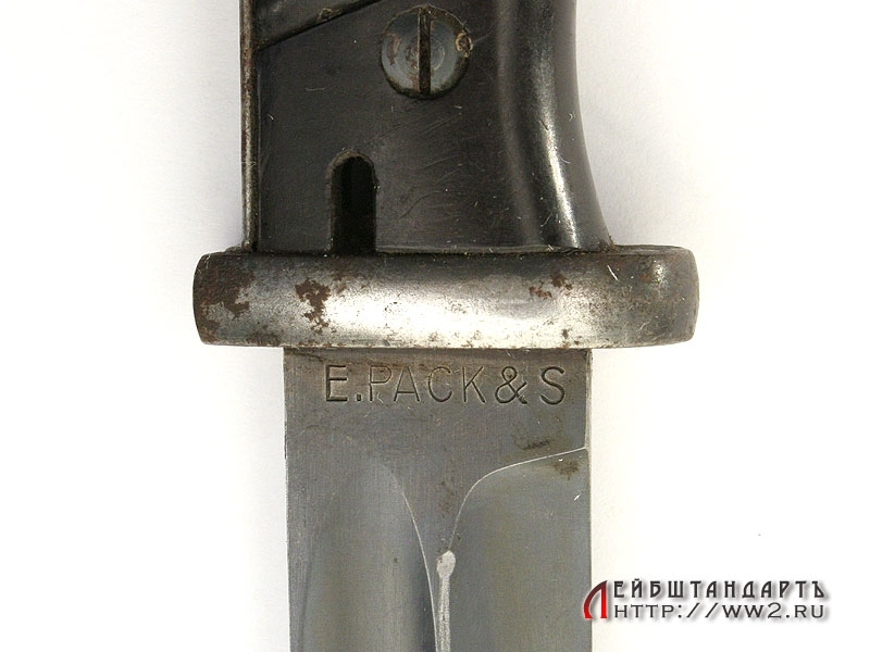 Штык к винтовке Маузер в очень хорошем коллекционном состоянии. На лицевой стороне клинка имеется порядковый номер. На оборотной также находится клеймо фирмы-изготовителя "E.Pack & S.". Клинок в оригинальном воронении. Элементы рукояти также вороненые, щечки изготовлены из эбонита с наклонными желобками. На кнопке и навершии имеются клейма военной приемки в виде имперских орлов. Ножны металлические, вороненые. Воронение частично сохранилось, имеется кожаный подвес, также в очень хорошем состоянии.