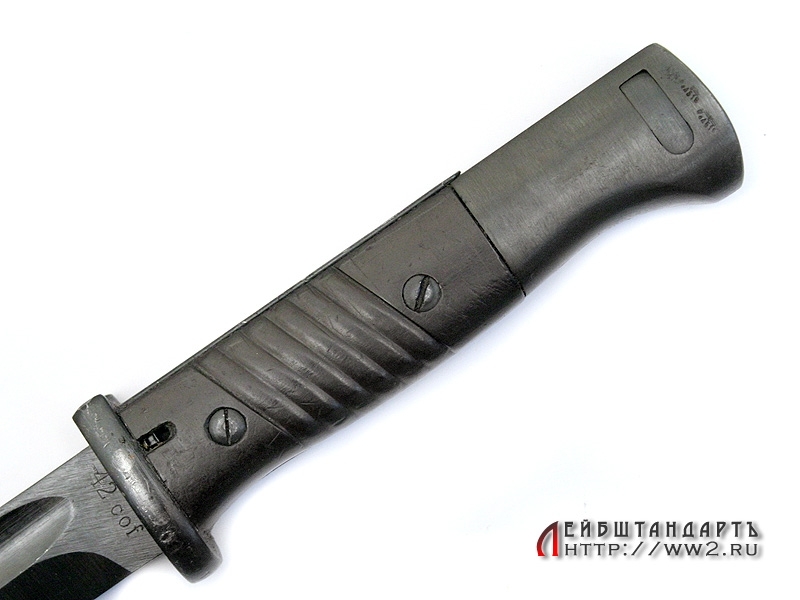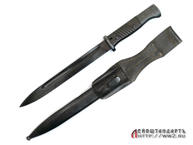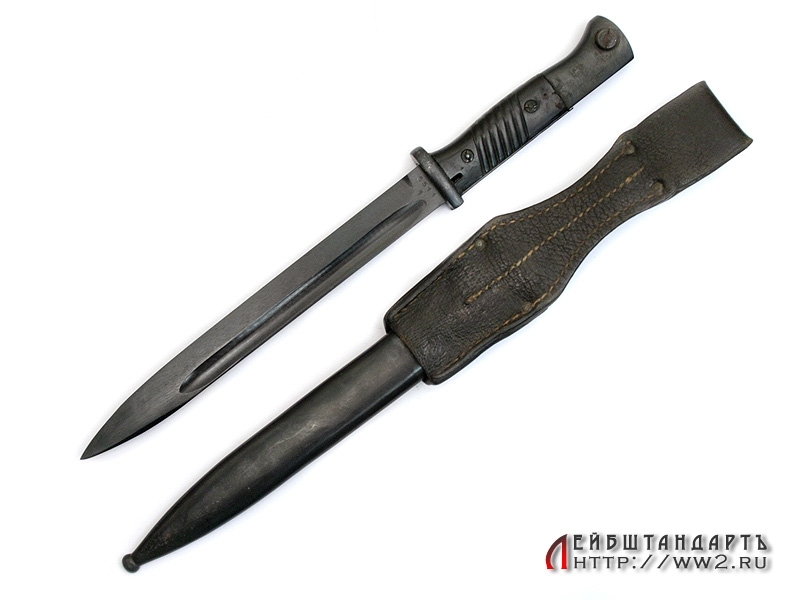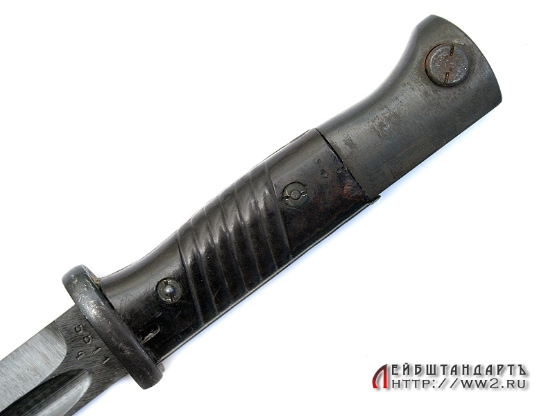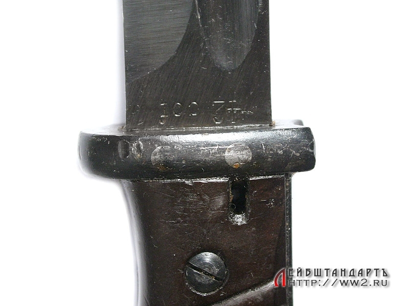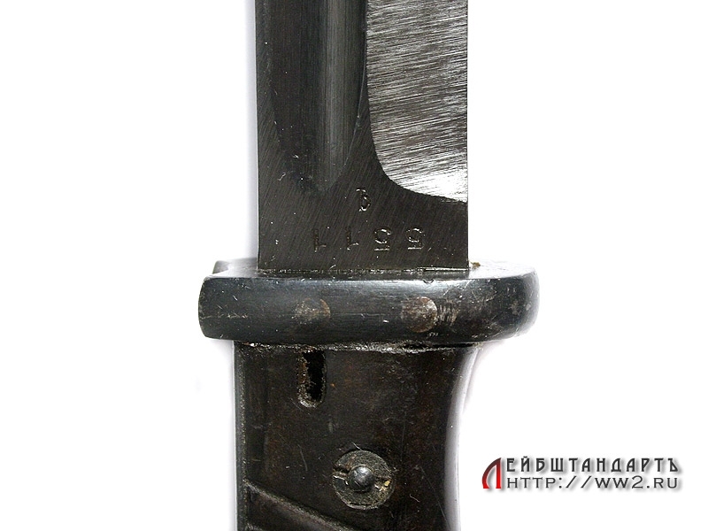 Штык к винтовке Маузера в отличном коллекционном состоянии. На обеих сторонах у основания клинка имеются порядковые номера. Клинок в оригинальном воронении. Элементы рукояти также вороненые, щечки изготовлены из бакелита. На кнопке и навершии имеются клейма военной приемки в виде имперских орлов. Ножны металлические, вороненые. Воронение сохранилось практически полностью, у основания ножен также имеются клейма, соответствующие клеймам на клинке. К штыку прилагается оригинальный кожаный подвес с клеймом.
