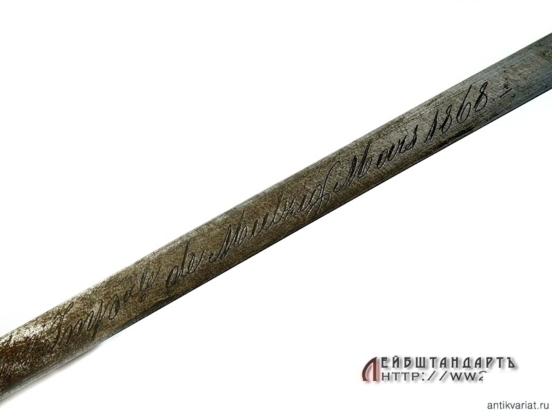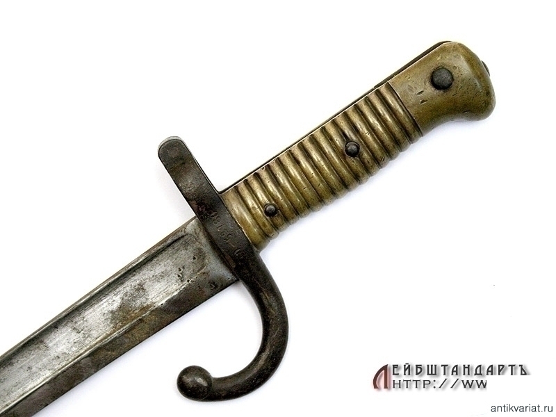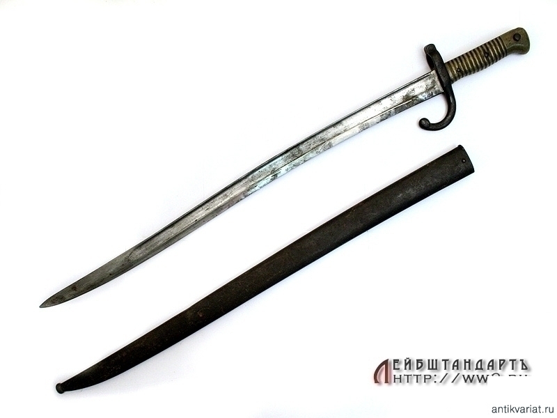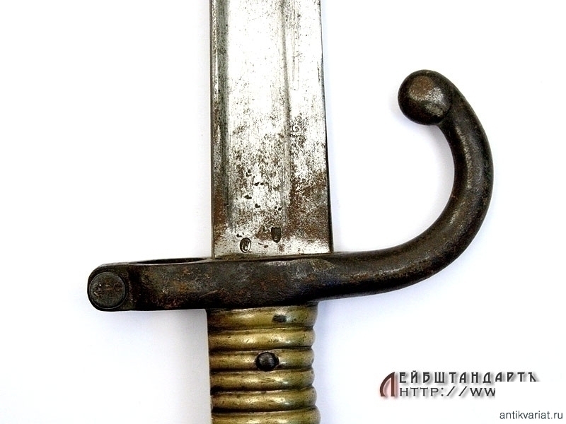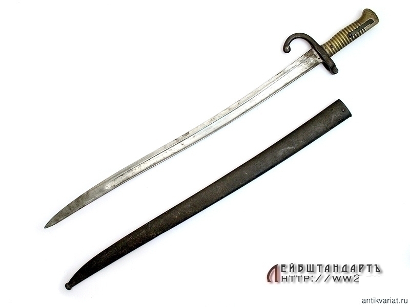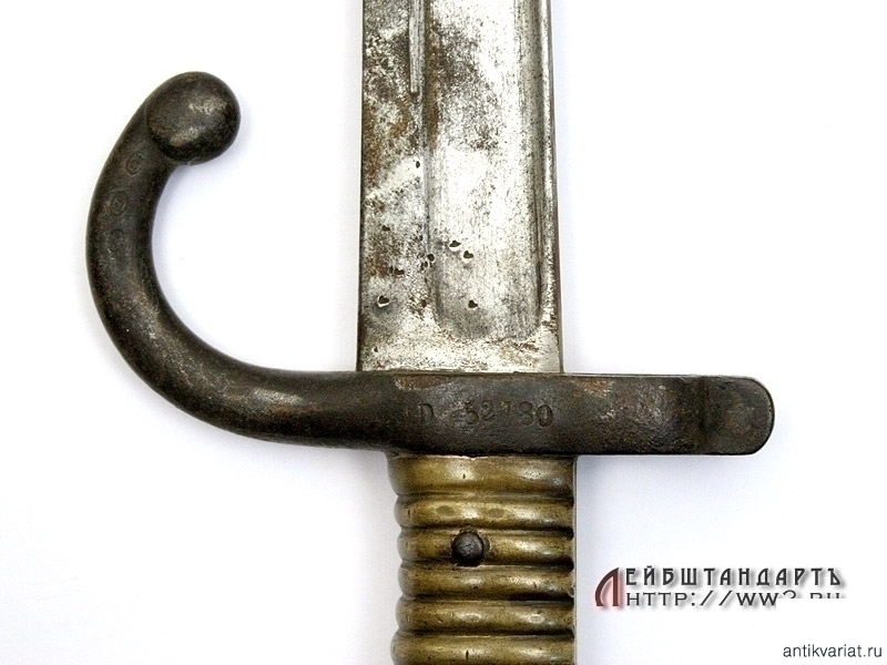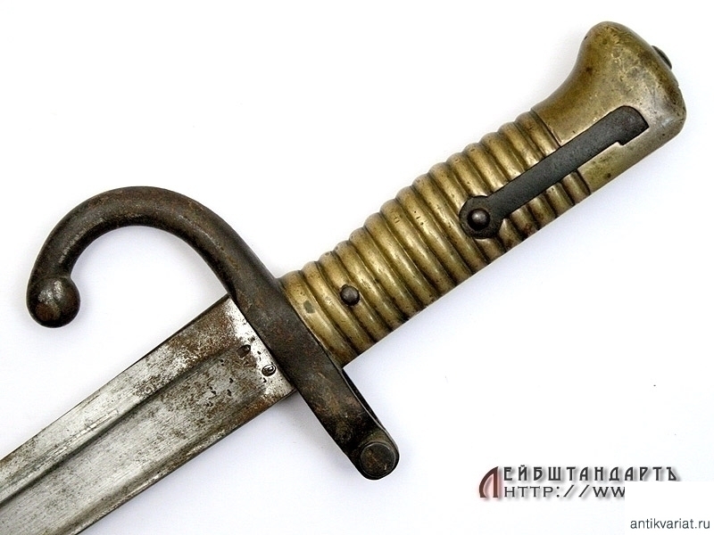 Штык образца 1866 года к винтовке системы Шасспо образца 1866 года. Рукоять бронзовая цельнолитая вместе с гардой и навершием. Навершие с Т-образным вырезом для крепления к винтовочному стволу, снабженное металлической кнопкой-фиксатором. Гарда загнутая вперед, уплощенная, с завершением в виде шарика. Клинок ятаганного типа, изогнутый, с долами, на спинке размещена гравированная вручную надпись с данными арсенала и датой выпуска - мартом 1868 года. У основания клинка и на гарде имеются также клейма государственной военной приемки. Ножны металлические, с прямоугольной скобой. У основания ножен выбиты порядковые номера.