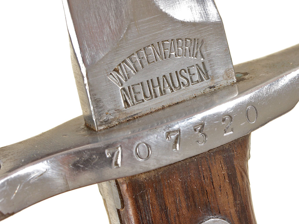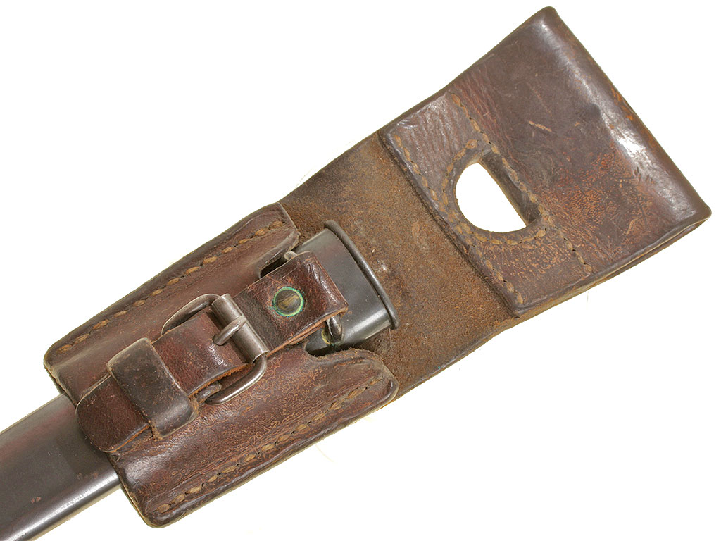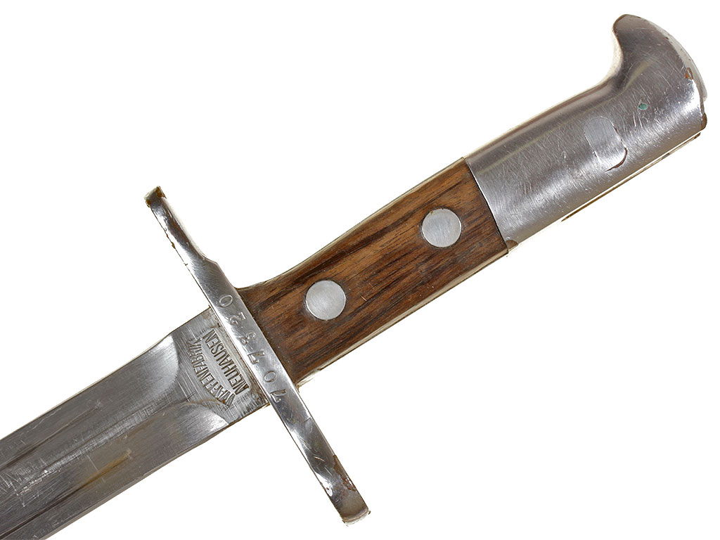 Штык швейцарский образца 1918 года к пехотной винтовке системы Шмидт - Рубина образца 1911. С клеймом "WAFFENFABRIK NEUHAUSEN" у основания клинка. Ножны металлические, вороненые, оригинальный кожаный подвес.