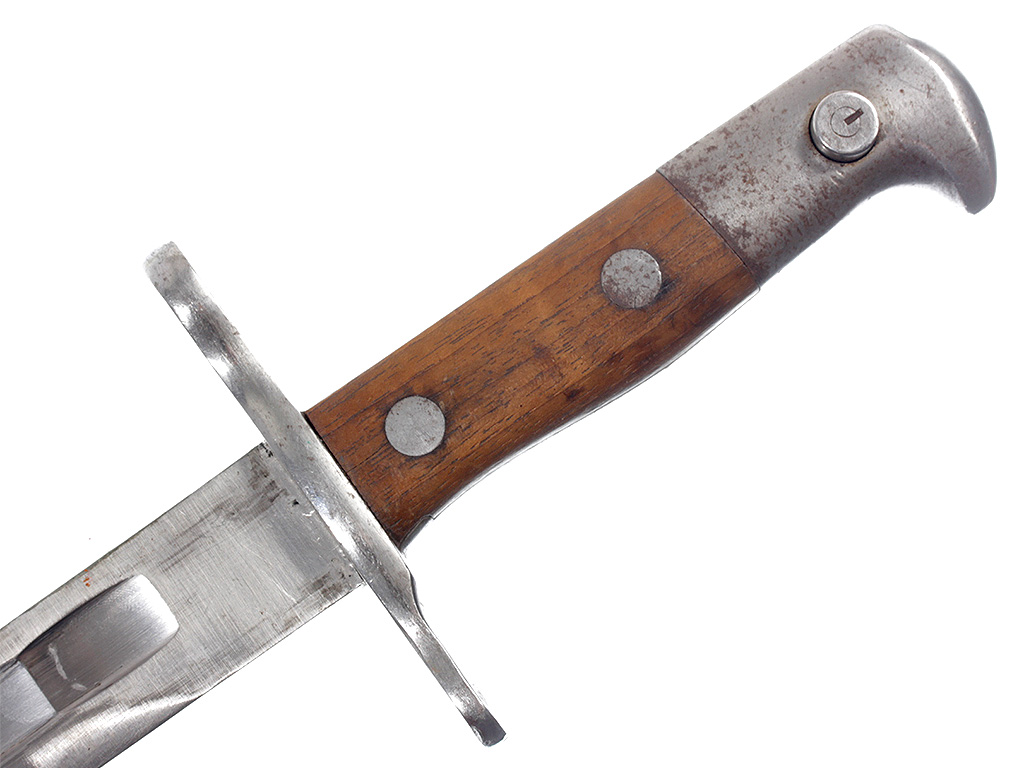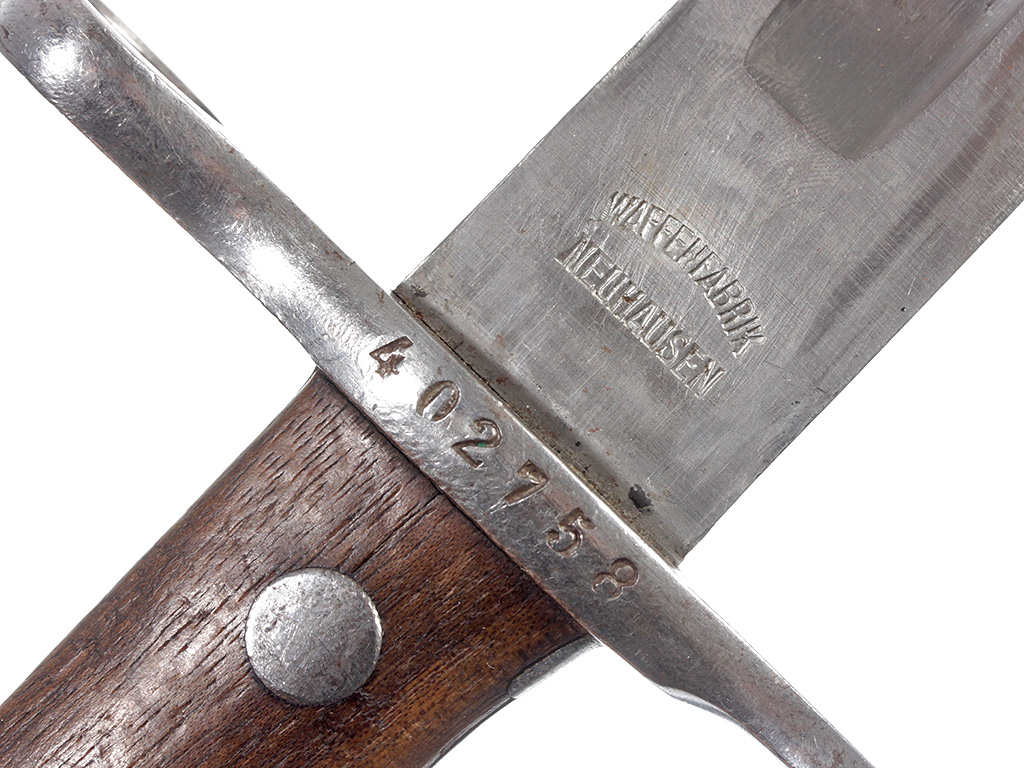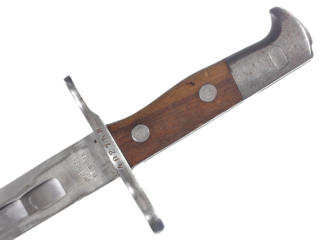 Штык швейцарский образца 1918 года к пехотной винтовке системы Шмидт - Рубина образца 1911. С клеймом "WAFFENFABRIK NEUHAUSEN" у основания клинка. Ножны металлические, вороненые, очень хорошее состояние.