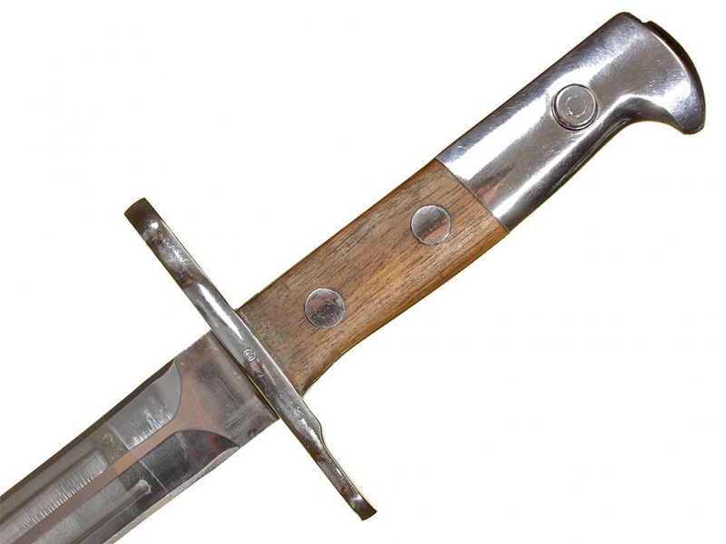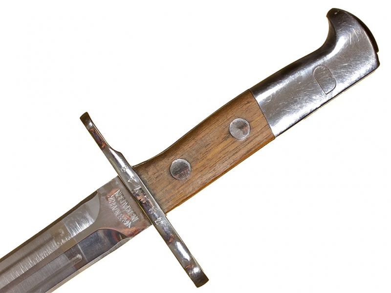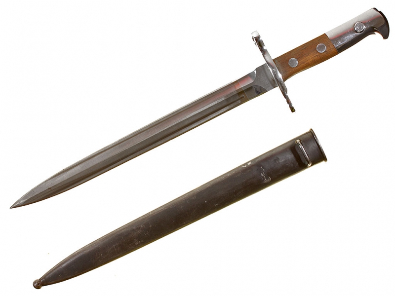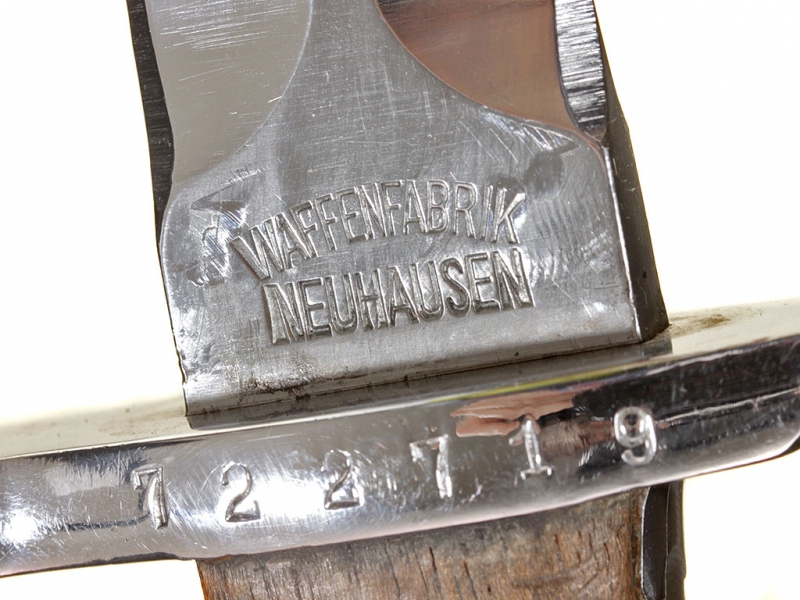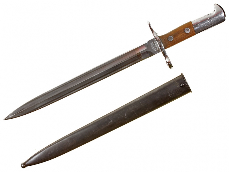 Штык швейцарский образца 1918 года к пехотной винтовке системы Шмидт - Рубина образца 1911. С клеймом "WAFFENFABRIK NEUHAUSEN" у основания клинка. Ножны металлические, вороненые.