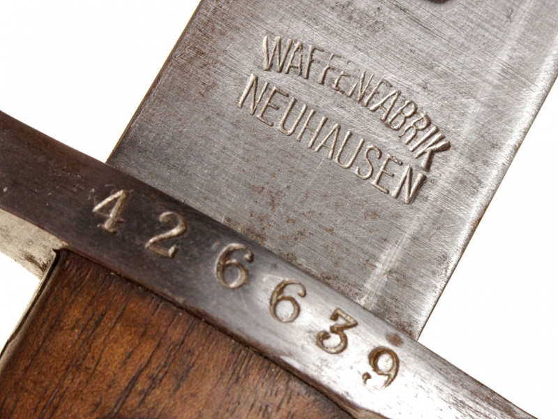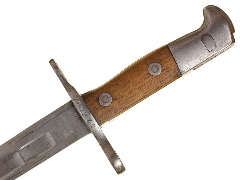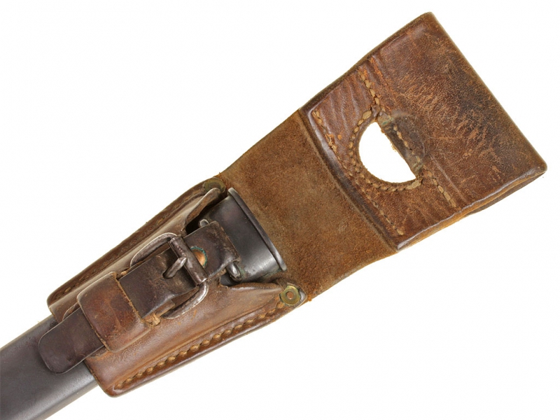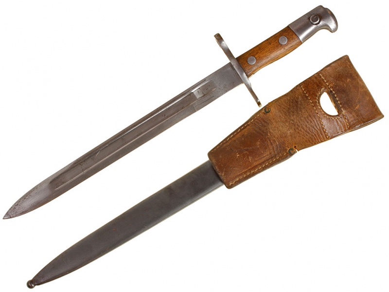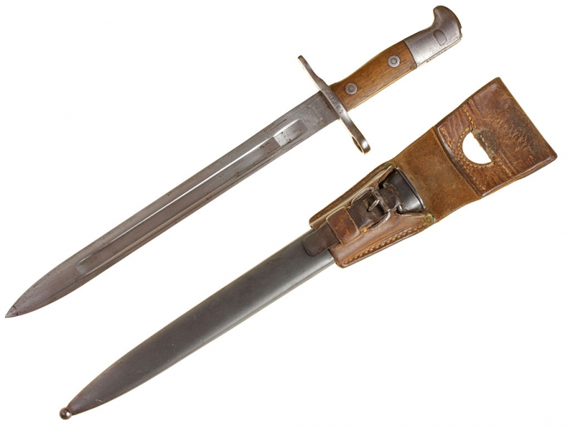 Штык швейцарский образца 1918 года к пехотной винтовке системы Шмидт - Рубина образца 1911. С клеймом "WAFFENFABRIK NEUHAUSEN" у основания клинка. Ножны металлические, вороненые, оригинальный кожаный подвес.