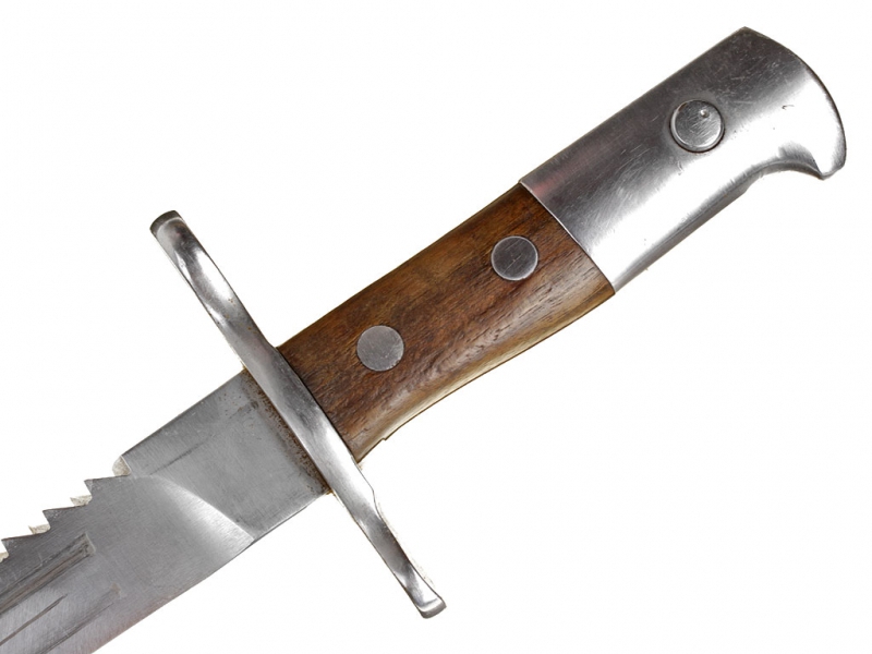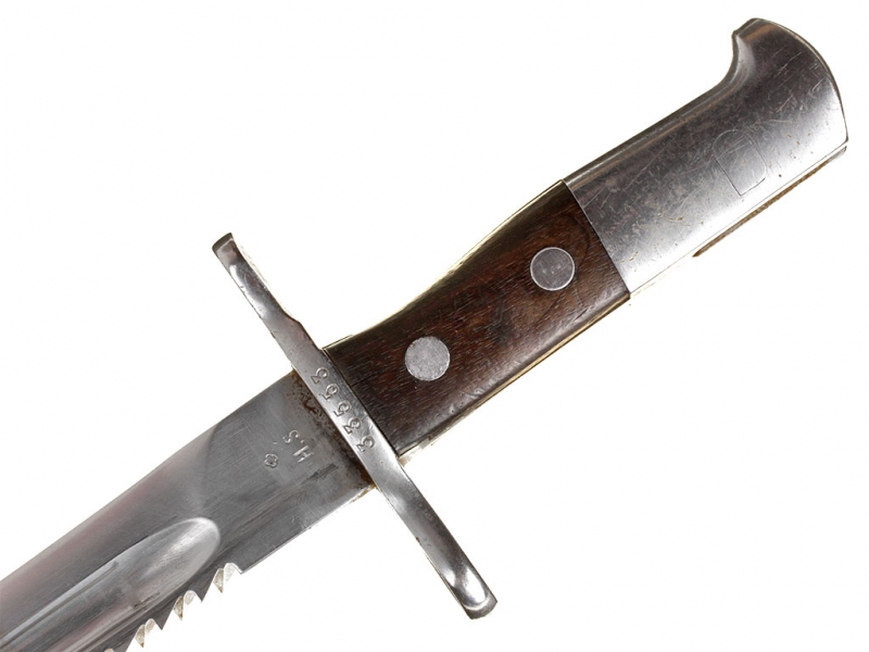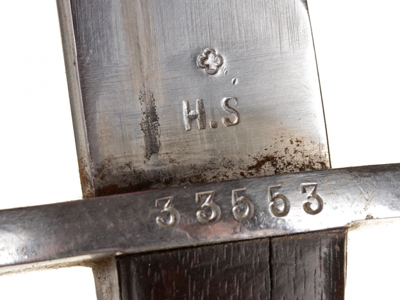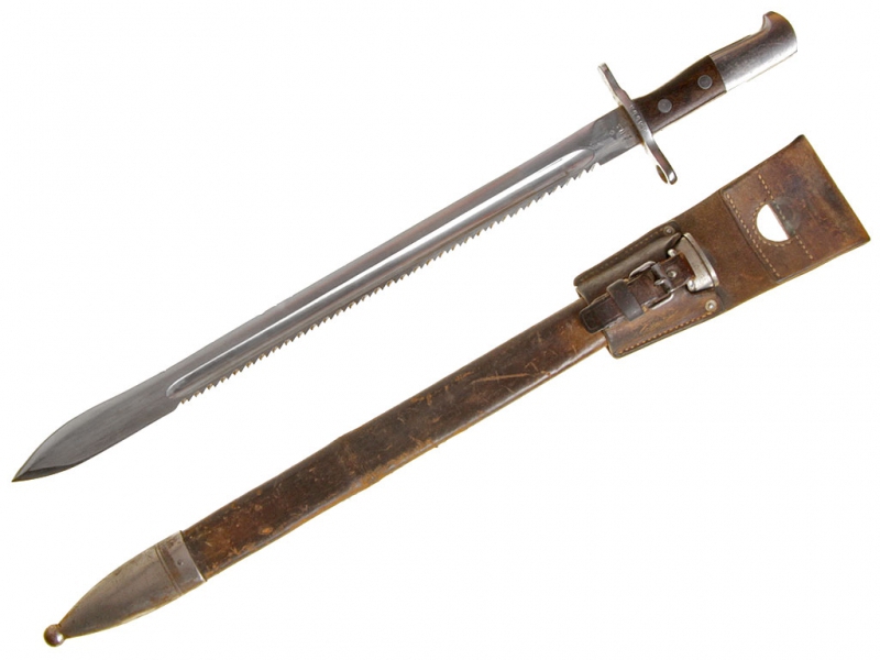 Штык швейцарский образца 1918 года к пехотной винтовке системы Шмидт - Рубина образца 1911. Саперный вариант с пилой, с клеймом "H.S." у основания клинка. Ножны кожаные, с металлическим наконечником, оригинальный кожаный подвес.
