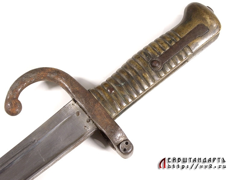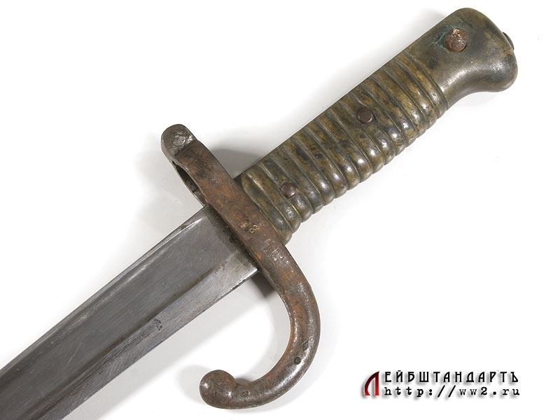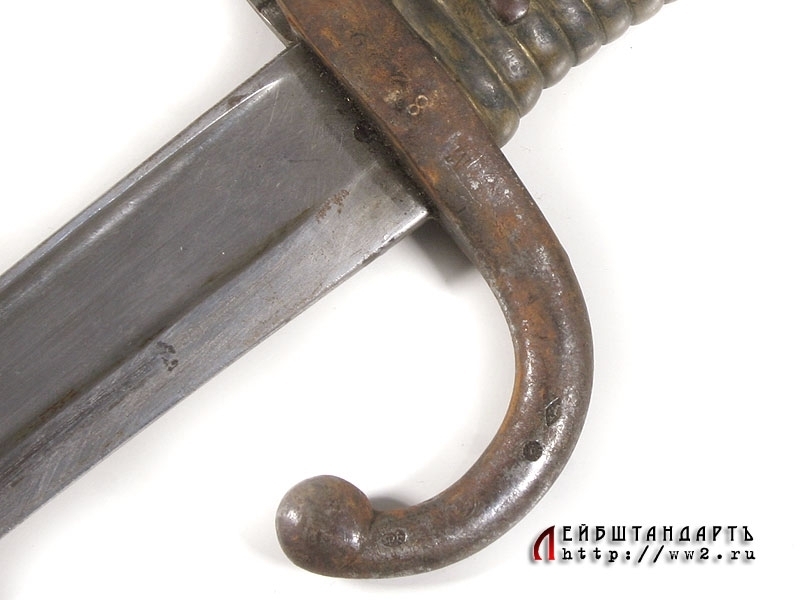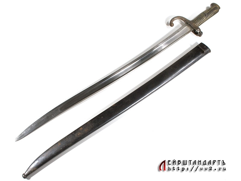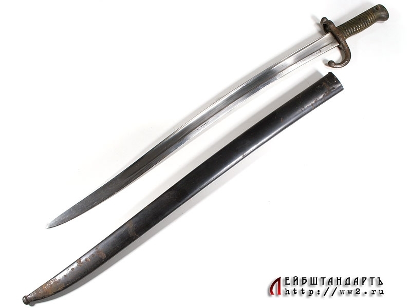 Штык образца 1866 года к винтовке системы Шасспо образца 1866 года. Рукоять бронзовая цельнолитая вместе с гардой и навершием. Навершие с Т-образным вырезом для крепления к винтовочному стволу, снабженное металлической кнопкой-фиксатором. Гарда загнутая вперед, уплощенная, с завершением в виде шарика. Клинок ятаганного типа, изогнутый, с долами, на спинке размещена гравированная вручную надпись: "S-Etienne Fevrier 1873", свидетельствующая о том что данный штык произведен на военной мануфактуре в Сент-Этьене в феврале 1873 года. У основания клинка и на гарде имеются также клейма государственной военной приемки. Ножны металлические, с прямоугольной скобой. У основания ножен выбиты порядковые номера.