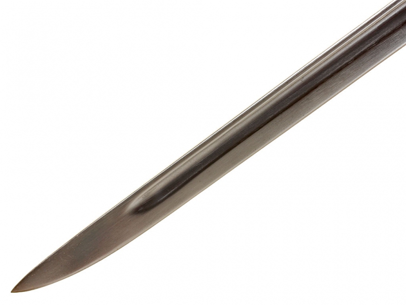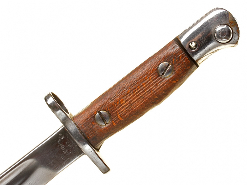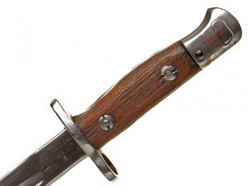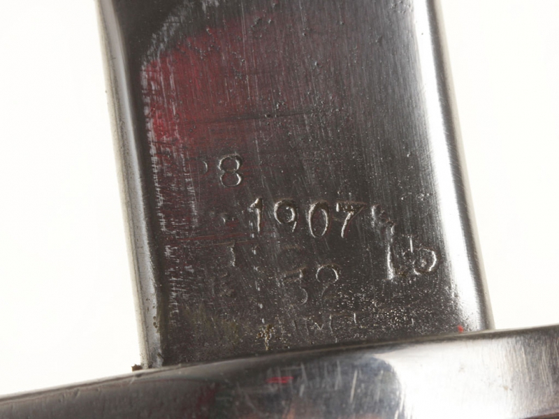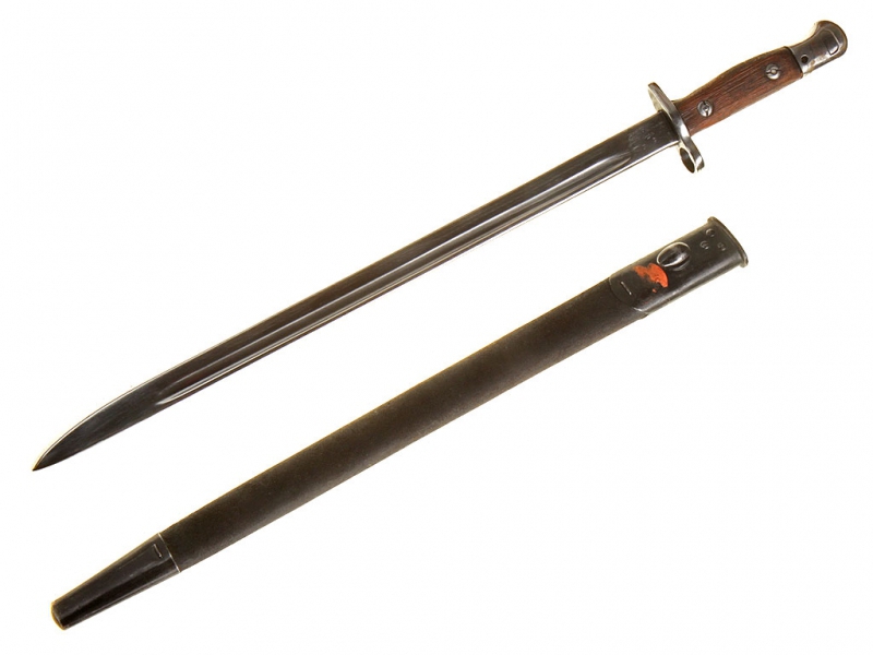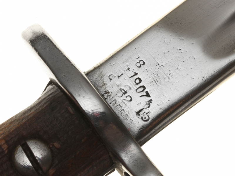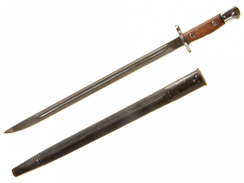 Штык английский образца 1907 года (модификация 1913 года). Клинок с одним долом, у основания сохранилось оригинальное воронение. У основания клинка находятся клейма фирмы-изготовителя "Remington", клейма военной приемки и год выпуска (1907). Эфес стальной, вороненый, с деревянными щечками и кнопкой-фиксатором. Ножны кожаные, с железными устьем и наконечником. Клинок отполирован, щечки рукояти отреставрированы.