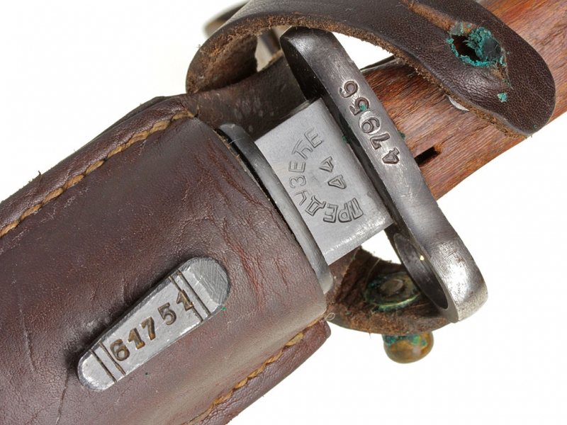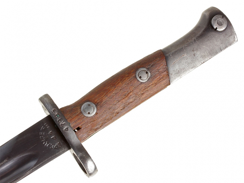 Штык югославского производства к винтовке системы Маузера образца 1924 года. Клинок в оригинальном воронении. У основания находятся клейма изготовителя "ПРЕДУЗЕТЕ 44". Рукоять стальная с двумя деревянными накладками, на гарде имеются номера и клейма военной приемки. Ножны стальные. Оригинальный подвес.