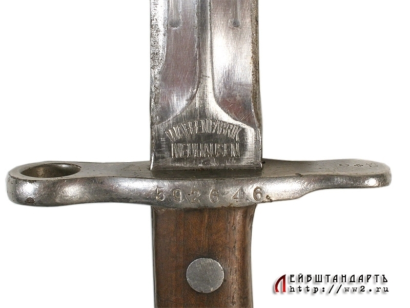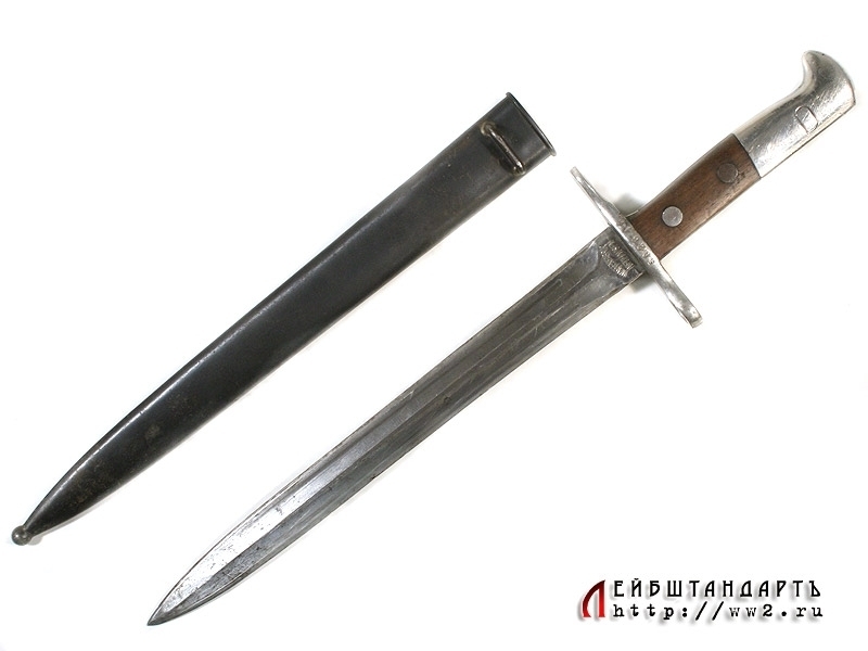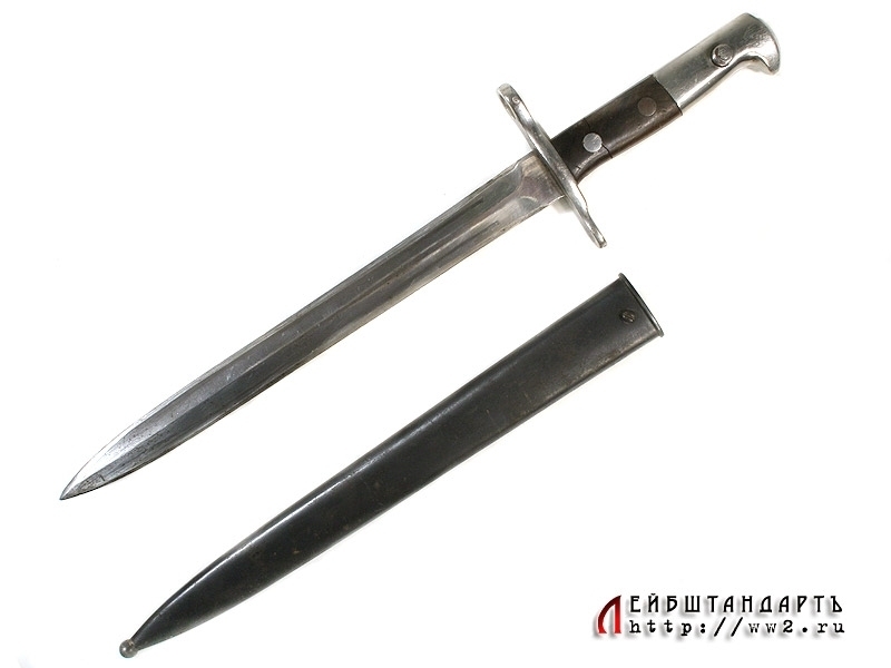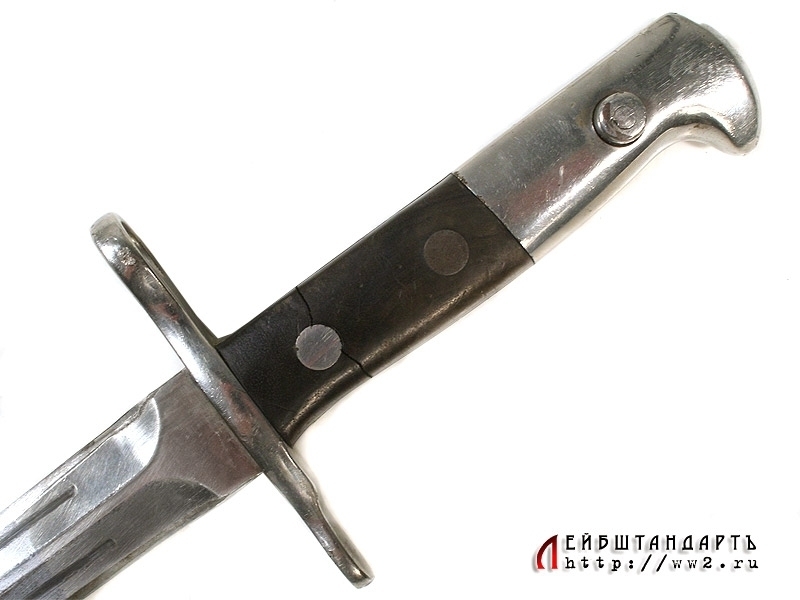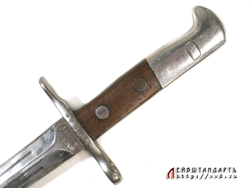 Штык швейцарский образца 1918 года к пехотной винтовке системы Шмидт - Рубина образца 1911 года в очень хорошем коллекционном состоянии. У основания клинка имеется клеймо "Waffenfabrik Neuhausen". Клинок в заводской заточке. Элементы рукояти никелированные, щечки изготовлены из дерева. На перекрестии имеется порядковый номер. Ножны металлические, вороненые. Воронение сохранилось практически полностью, у основания ножен имеется клеймо военной приемки.
