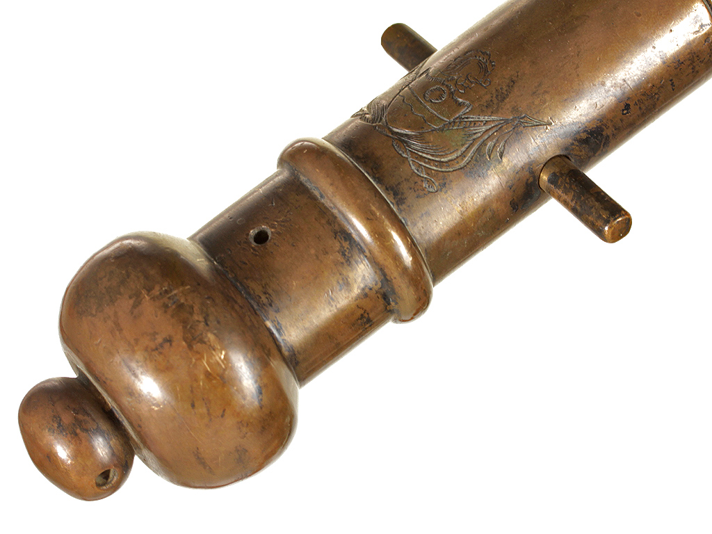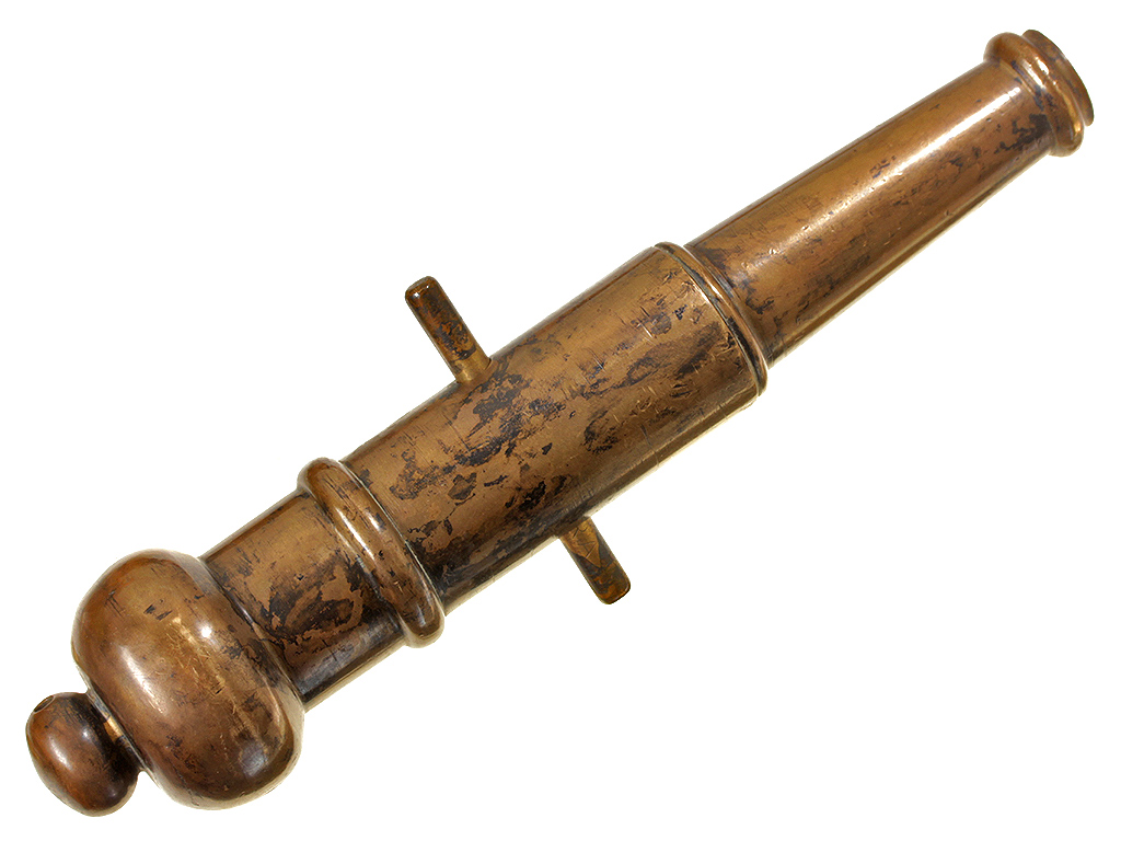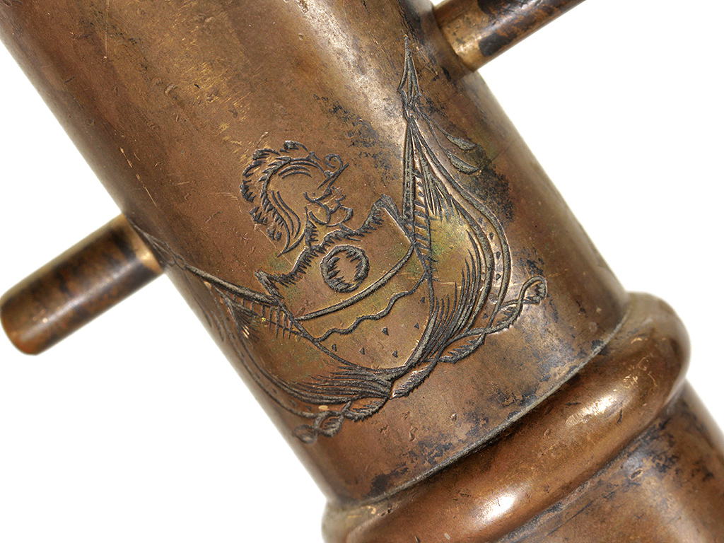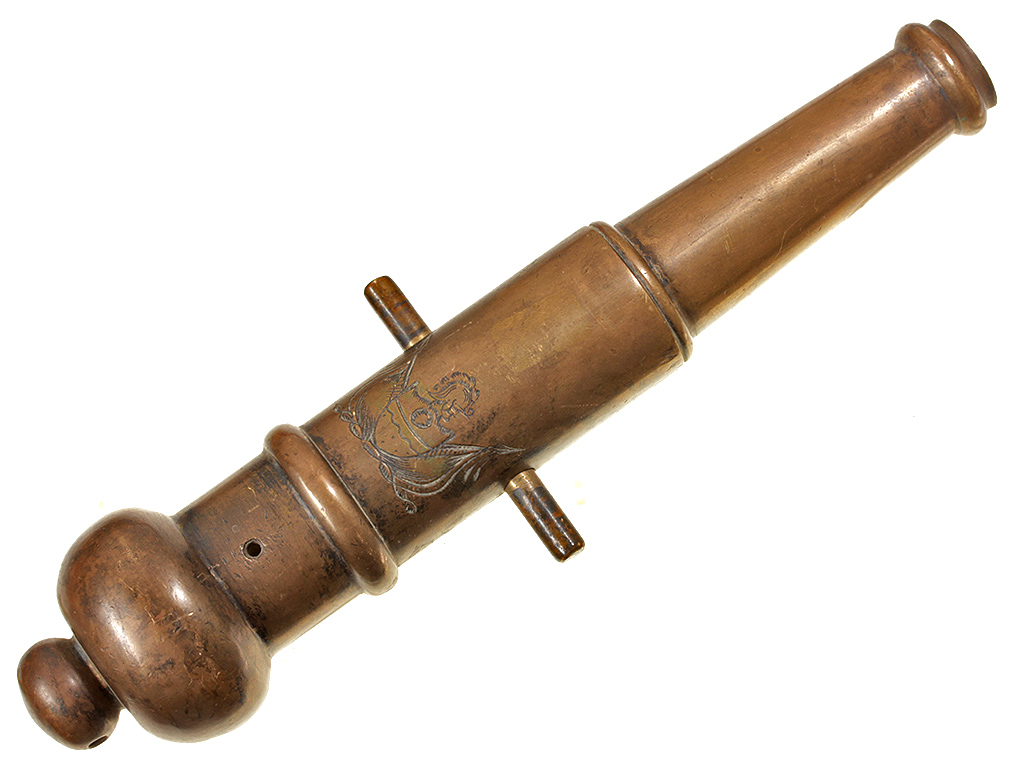 Миниатюрная сигнальная пушка, изготовленная в конце XIX века. Бронзовый массивный ствол длиной 20,7 см и калибром 12,5 мм гладкий, без клейм, с двумя боковыми цапфами. Казенная часть украшена гравированным изображением стилизованного гербового щита.