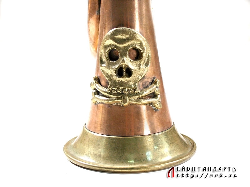 Сигнальный горн с напаянным черепом гусарского типа времен Первой мировой войны в очень хорошем состоянии. Основная часть изготовлена из меди, устье и мундштук - из желтой латуни, как и накладка в виде черепа.