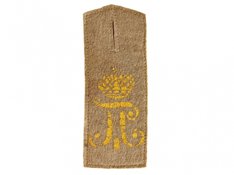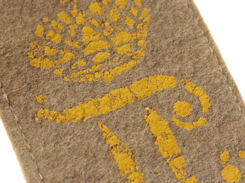 Одиночный полевой погон рядового Гренадерского саперного батальона. Погон односторонний, пристяжной, лицевая сторона защитного цвета с зеркально нанесенной желтой краской шифровкой.