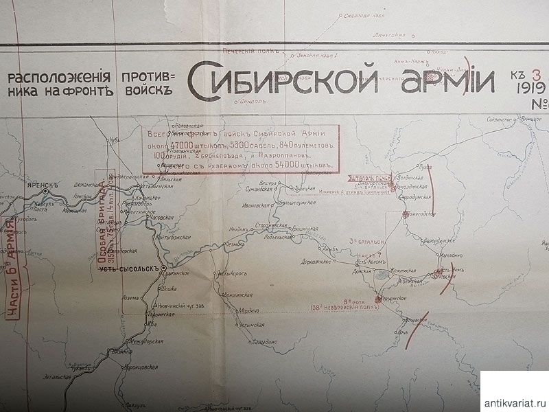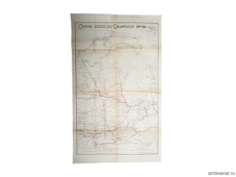 Схема расположения войск противника на фронте Сибирской армии к 3 мая 1919 года. Размер 100 х 61,5 см. Очень хорошее состояние.