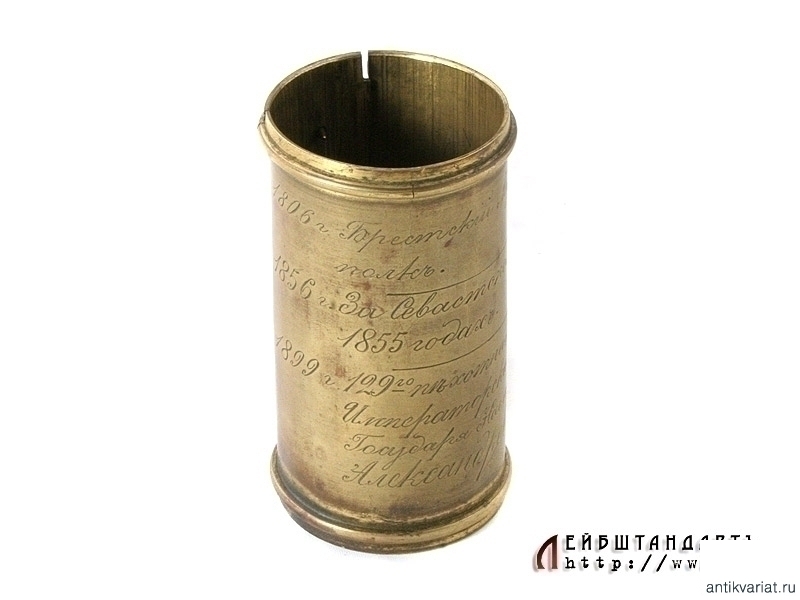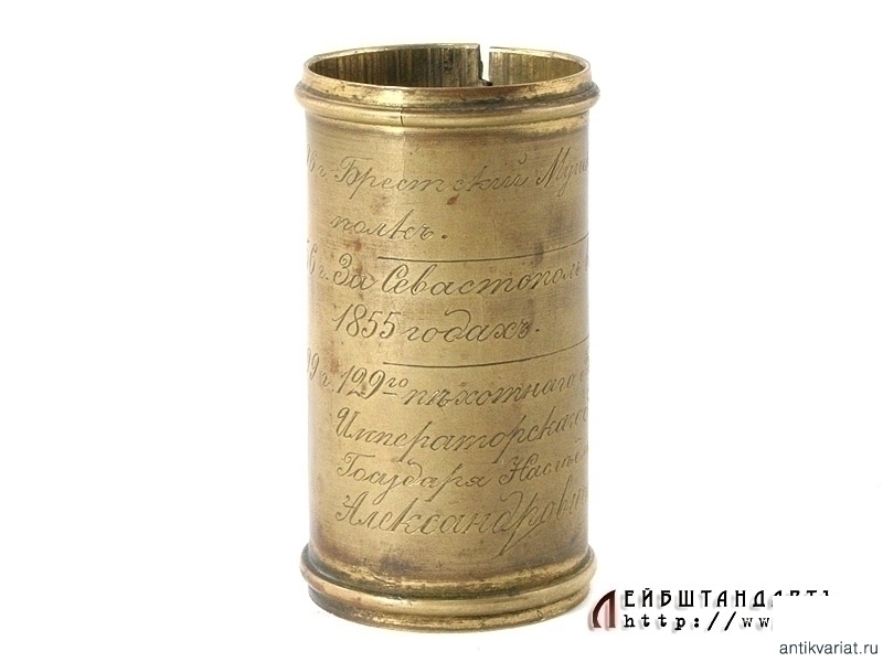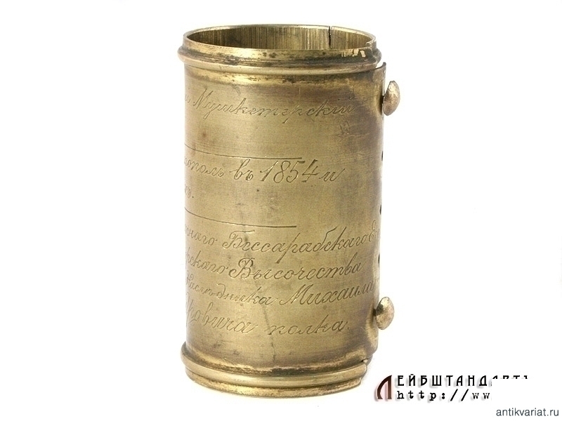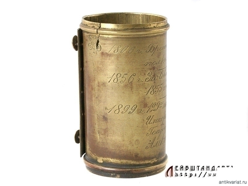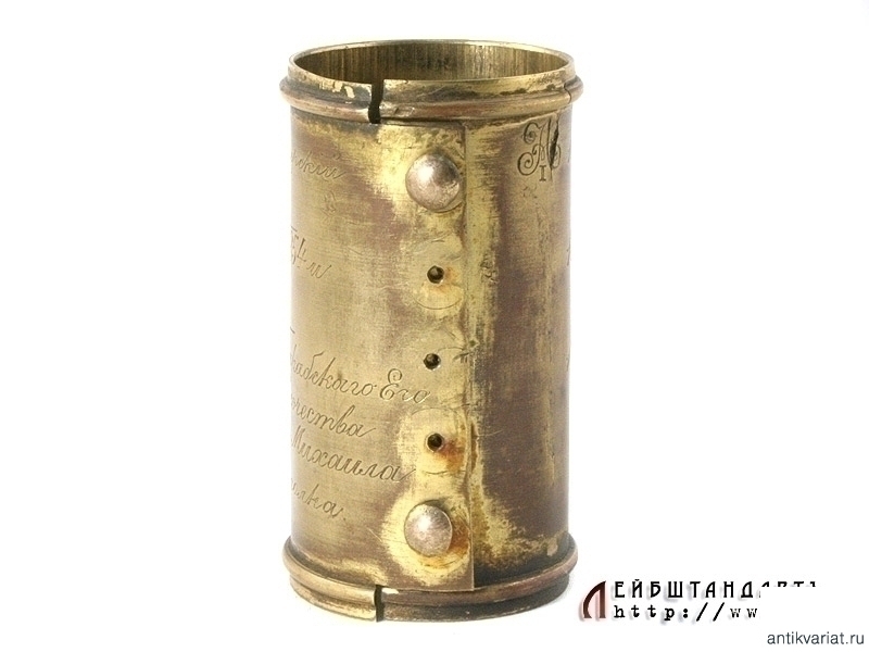 Латунная вызолоченная скоба, надеваемая на древко знамени ниже полотнища, образца 1838 года. В верхней строке - нанесенный гравировкой вензель Императора Александра Первого, при котором был основан полк (в данном случае - Брестский Мушкетерский полк, в 1806 году). В средней строке - надпись отличия: "1856 год, за Севастополь в 1854 и 1855 годах", а в нижней строке - название части на момент изготовления знамени (1899 год): "129 пехотный Бессарабский Его Императорского Высочества Государя Наследника Михаила Александровича полк". Скоба крепилась к древку при помощи позолоченных латунных гвоздиков с выпуклыми круглыми шляпками, два из которых сохранились. Частично также сохранилось оригинальное золочение на самой скобе. Необходимо отметить, что подобные полковые реликвии встречаются крайне редко.