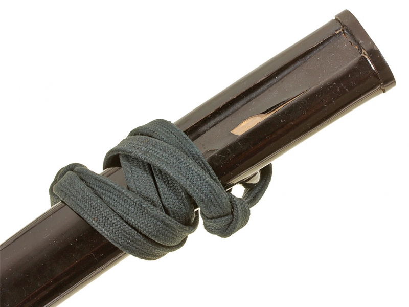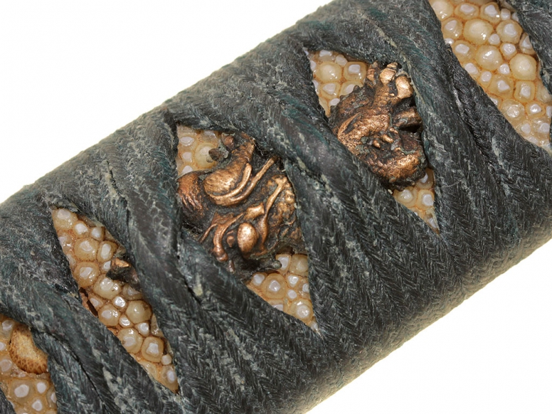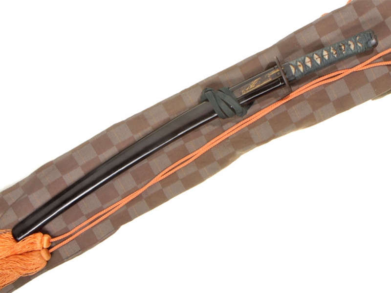 Короткий самурайский меч вакидзаси, изготовленный в конце периода Эдо (начало - первая половина XIX века). Хвостовик без подписи мастера, имеет одно крепежное отверстие. Клинок с выраженной волнистой линией закалки. Рукоять деревянная, обтянутая кожей ската, оплетена тесьмой светло-синего цвета. Цуба стальная, овальной формы. Фути и касира парные, фути декорирована золоченым изображением иероглифа. Мэнуки выполнены в виде фигурок драконов. Кодзука с бронзовой золоченой рукоятью, исполненной в стиле, аналогичном стилю декора цубы. Ножны покрыты глянцевым черным лаком.