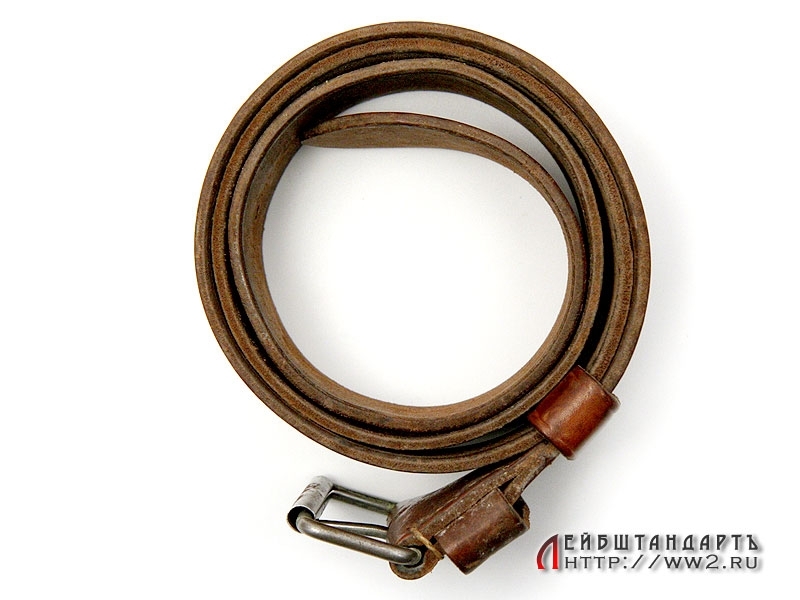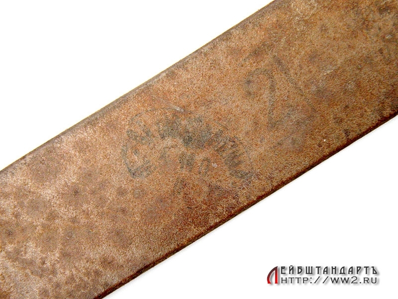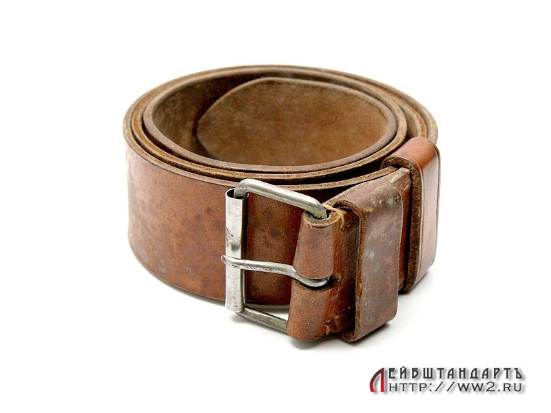 Кожаный солдатский полевой ремень с железной однозубой рамочной пряжкой. На внутренней стороне имеются плохо читаемые чернильные штампы. Ремень в очень хорошем состоянии, в оригинальной прошивке.
