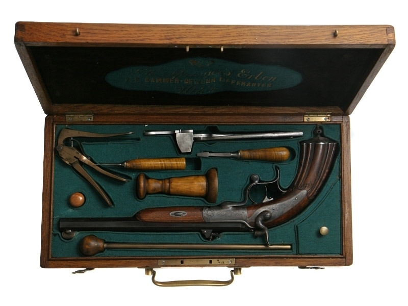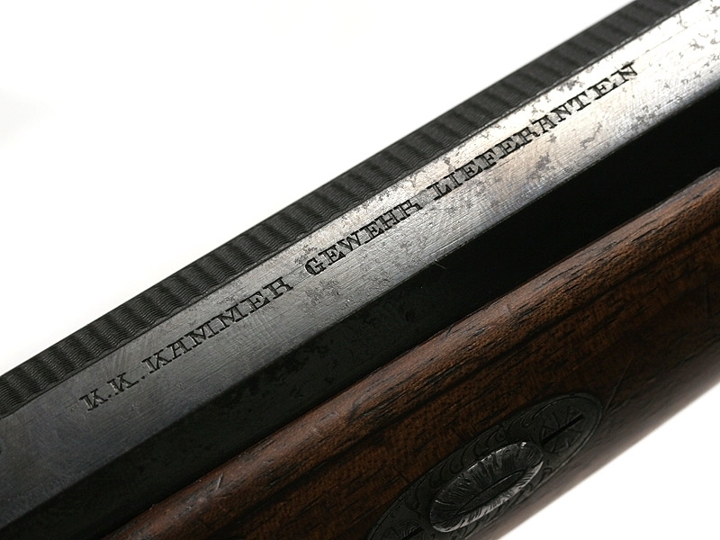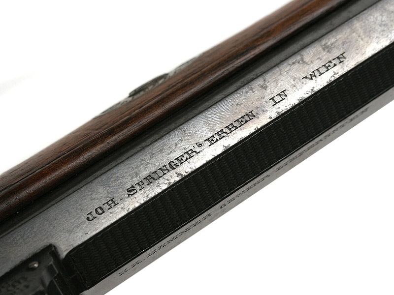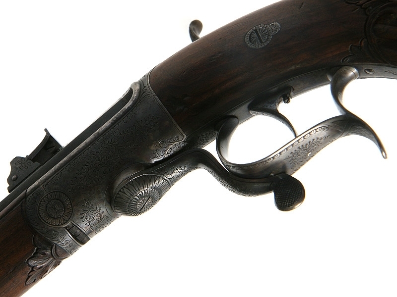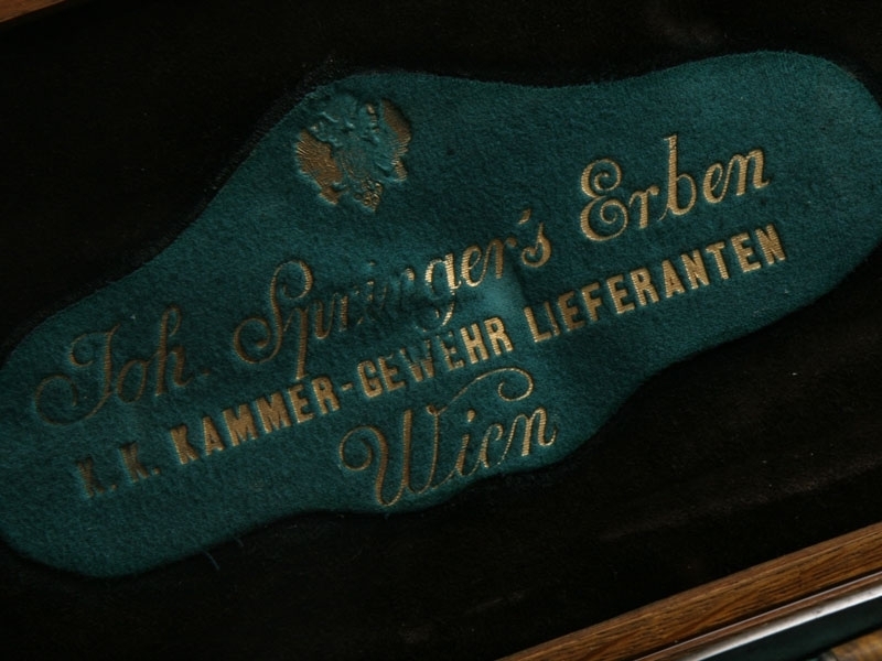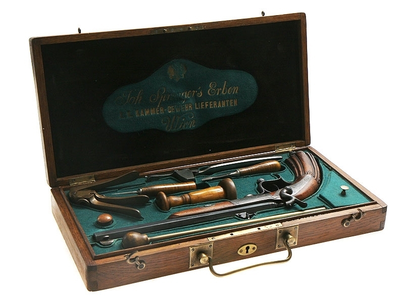 Спортивный пистолет для стендовой стрельбы середины - третьей четверти XIX века, изготовленный фирмой "K.K.Kammer Gewehr Lieferanten" в Вене. Внешне на первый взгляд пистолет производит впечатление капсульного, но на самом деле он изготовлен под унитарный патрон. Под скобой помещен специальный рычаг, при отведении которого конструкция "переламывается" и в патронник вставляется патрон (вероятнее всего, имевший латунную гильзу). В брандтрубке был установлен подпружиненный боек (ныне отсутствующий). Ствол граненый, отлично сохранилось воронение. С правой стороны выгравировано название фирмы. Целик регулируемый, с винтом для точной настройки, мушка также регулируемая: оружие предназначалось для спортивной стрельбы и предполагало высокую точность. Замок и прочие металлические элементы рукояти покрыты тончайшей штихельной гравировкой в виде растительного орнамента, на замке дополнительно выгравировано название фирмы-реализатора: "Joh. Springer"s Erben Wien".