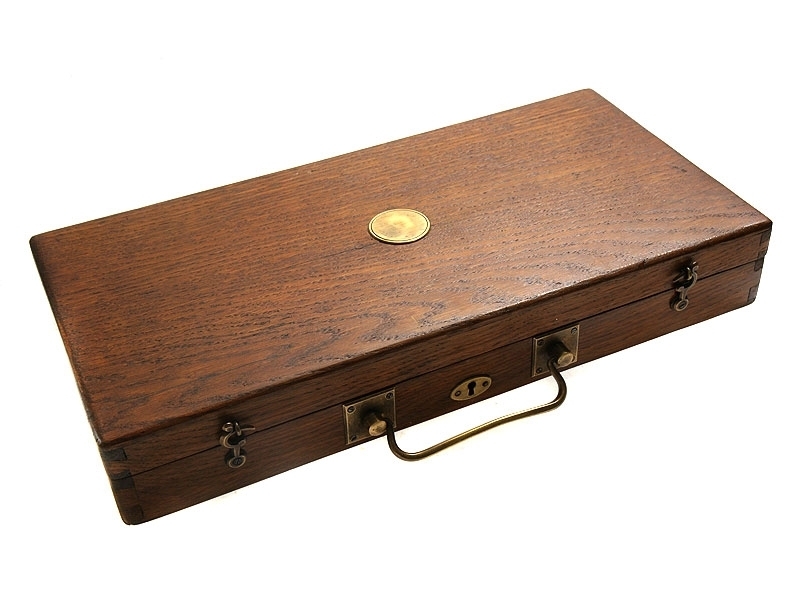 Оружие помещено в деревянный лакированный футляр с бархатным ложементом внутри. В специальных ячейках имеются приспособления для чистки, отвертка, пулелейка, а также приспособления для переснаряжения стреляных гильз. Футляр имеет ручку для переноски и закрывается на ключ.