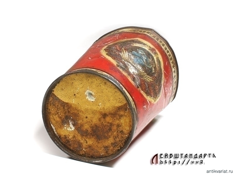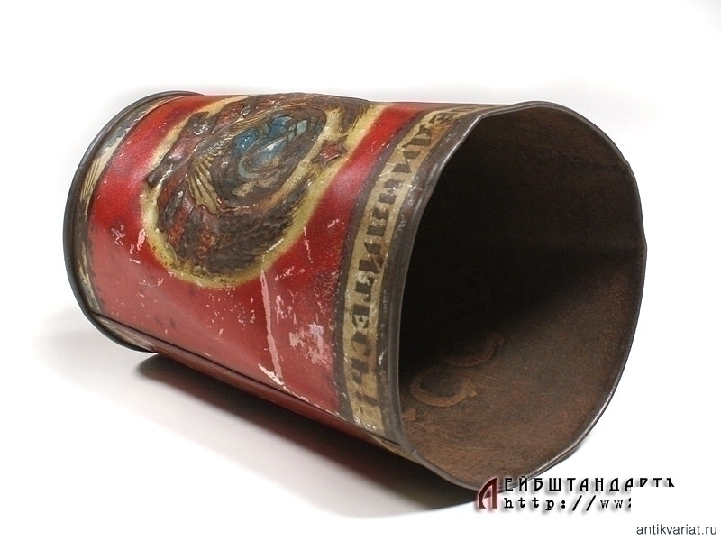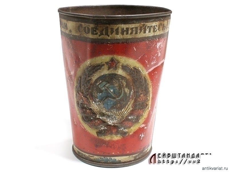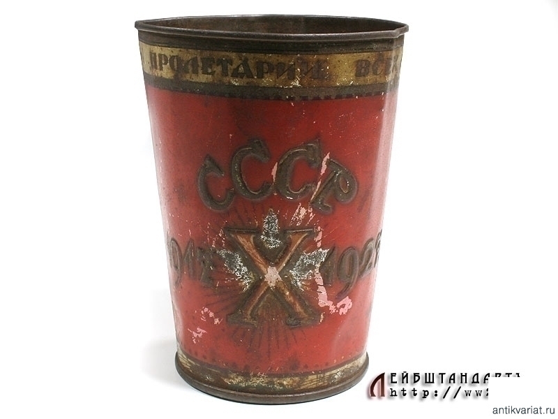 Жестяной штампованный стакан, украшенный гербом СССР и датами: "1917 - 1927". Вверху по ободку стакана помещен девиз: "Пролетарии всех стран, соединяйтесь!". Предмет в хорошей сохранности, практически полностью сохранилось оригинальное красочное покрытие. Изнутри имеется незначительный поверхностный налет ржавчины.