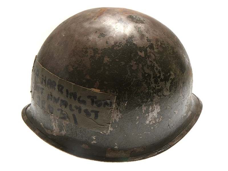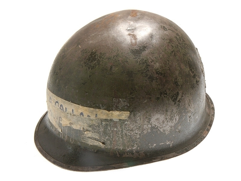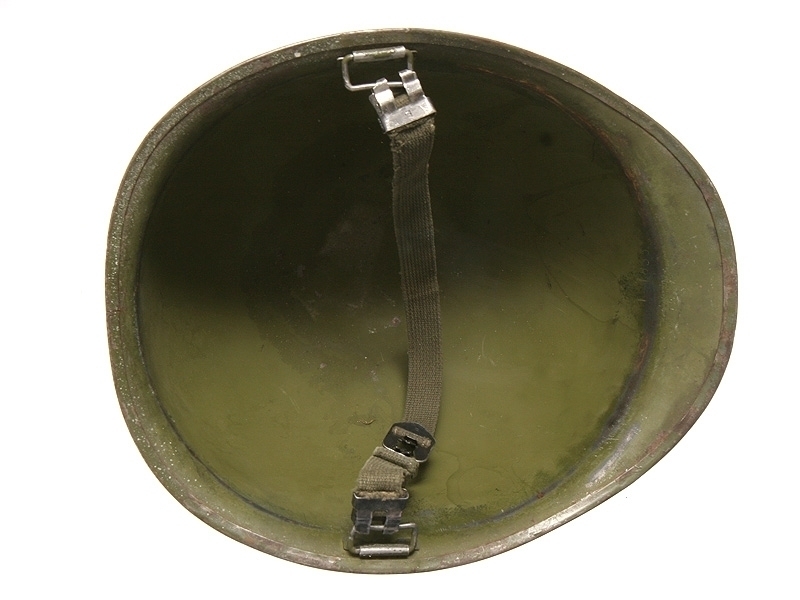 Стальной шлем с брезентовым подбородочным ремешком образца Второй мировой войны. Хорошее состояние.