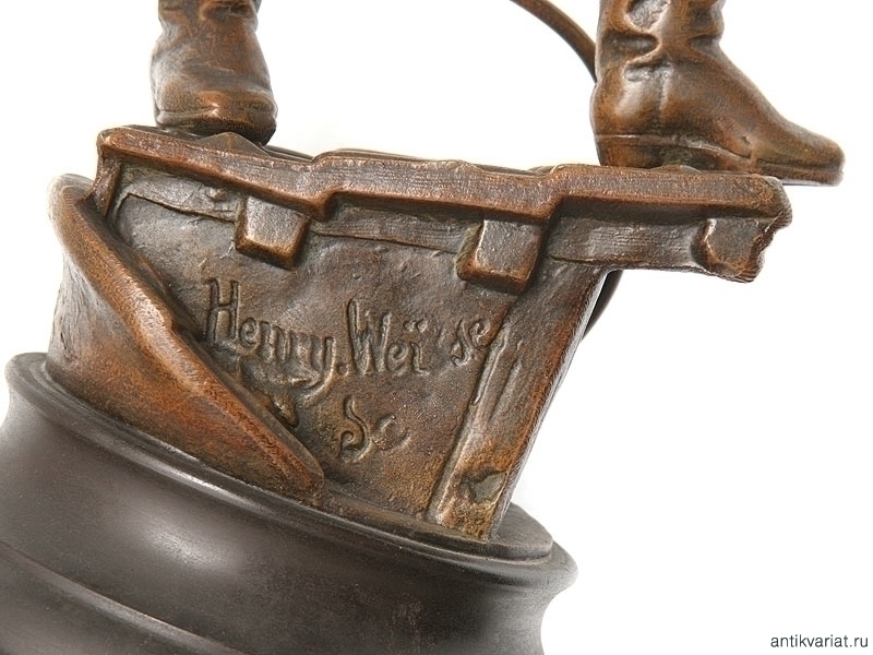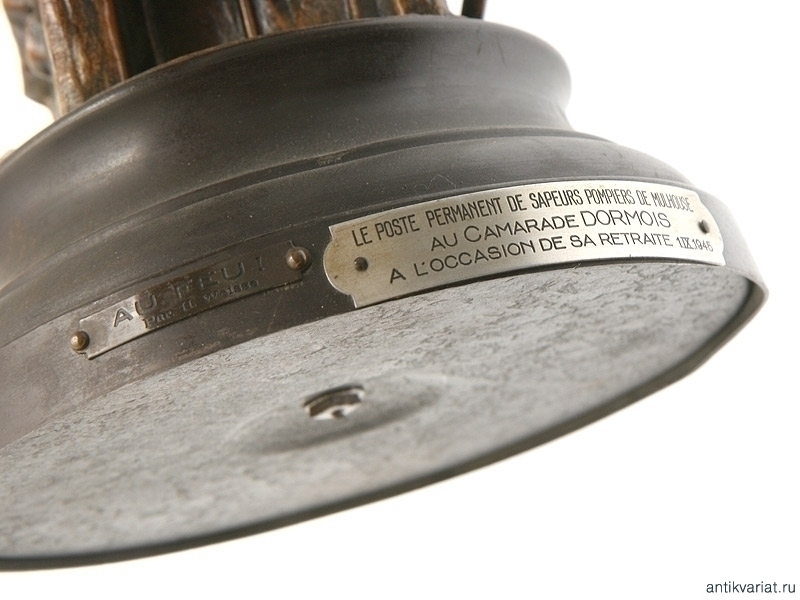 Большая интерьерная статуэтка, изображающая пожарного с брандспойтом. Начало ХХ века. Цинковый сплав, на деревянной подставке укреплена подарочная табличка, датированная 1945 годом.