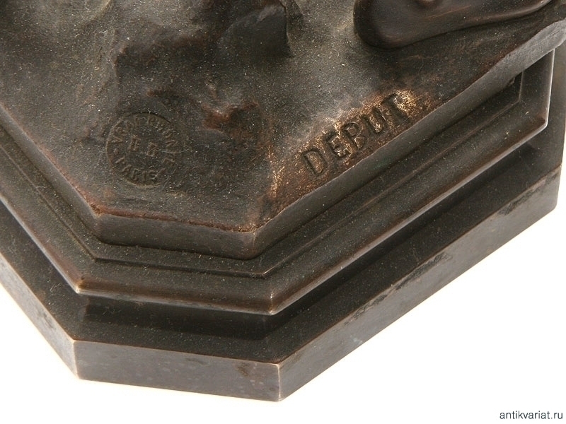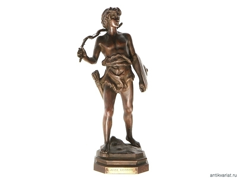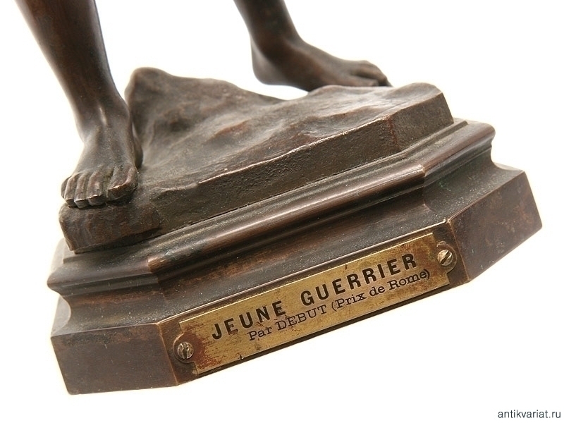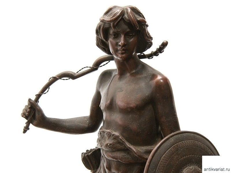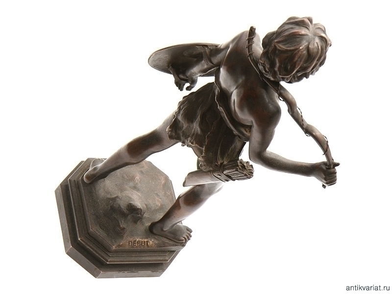 Статуэтка, изображающая полуобнаженного юношу с луком на плече и щитом в руке. На поясе - колчан со стрелами. На подставке имеется подпись "Debut" и штамп литейной мастерской в Париже. С лицевой стороны прикреплена табличка с названием статуэтки. Бронза, патинирование.