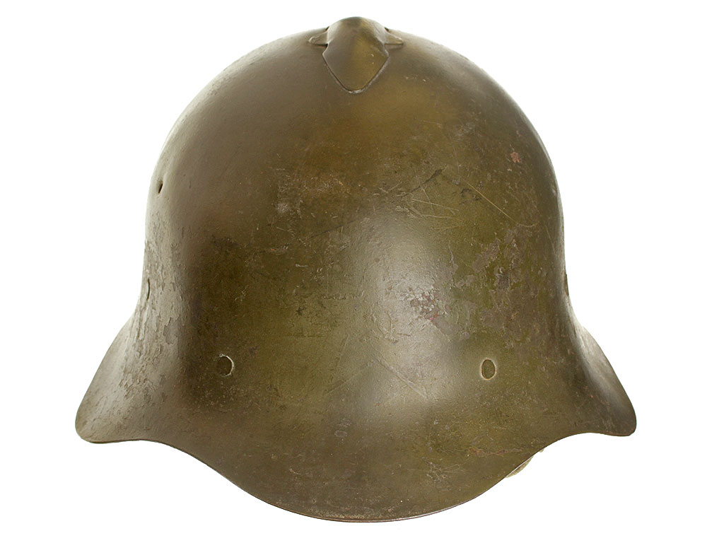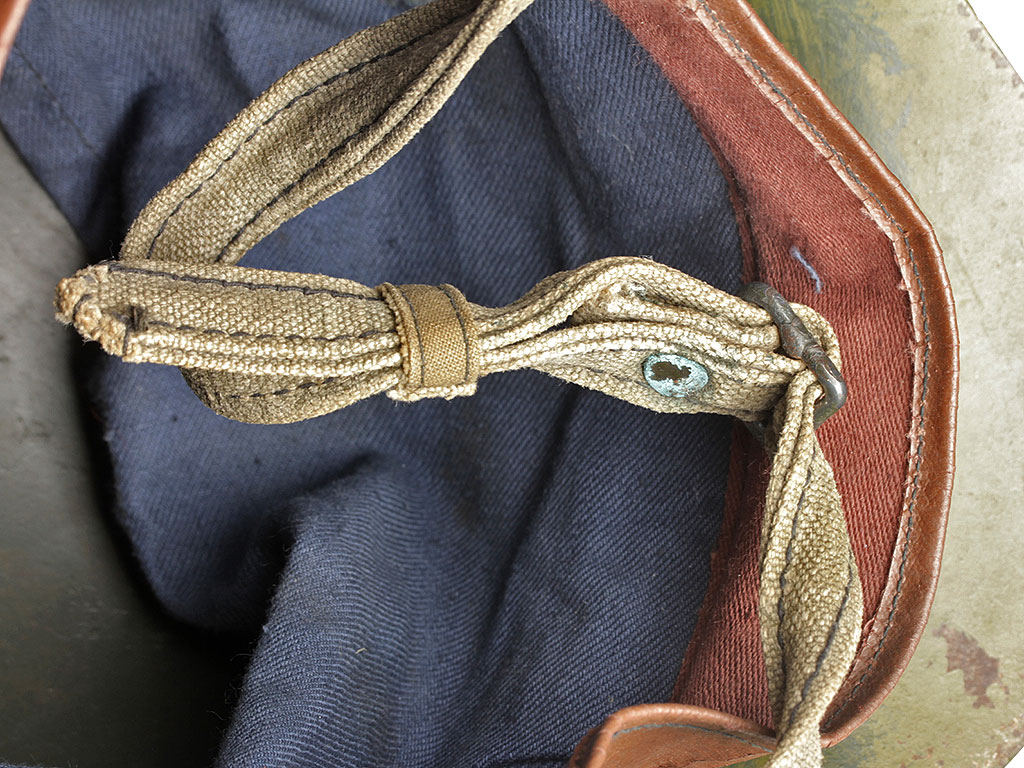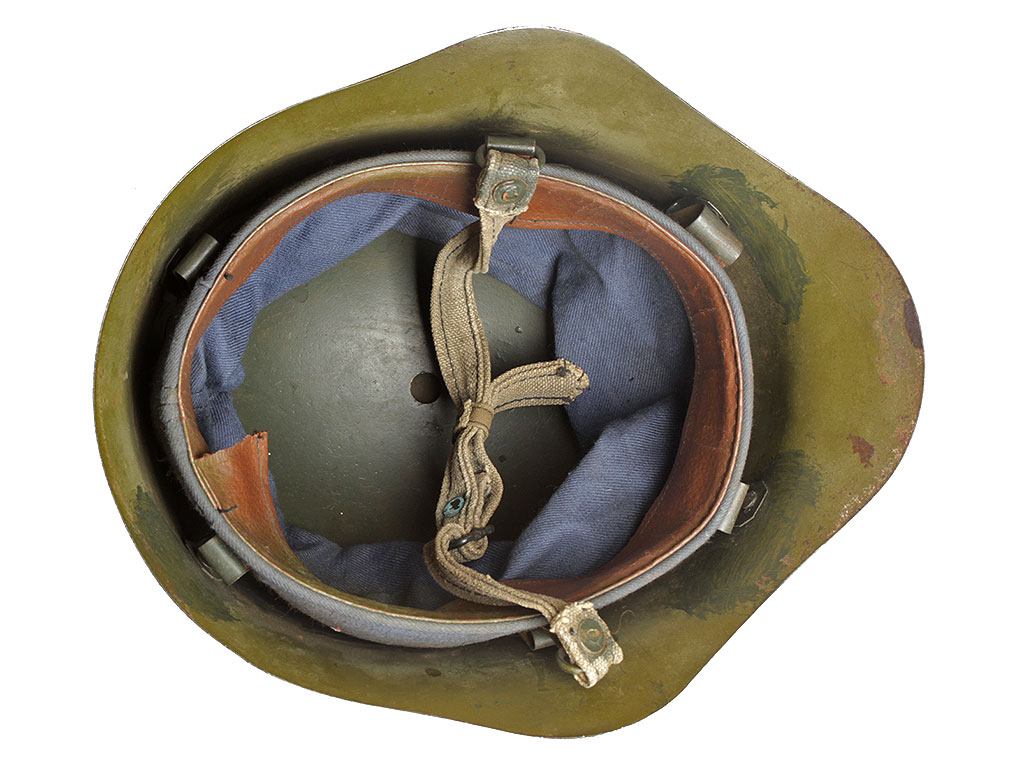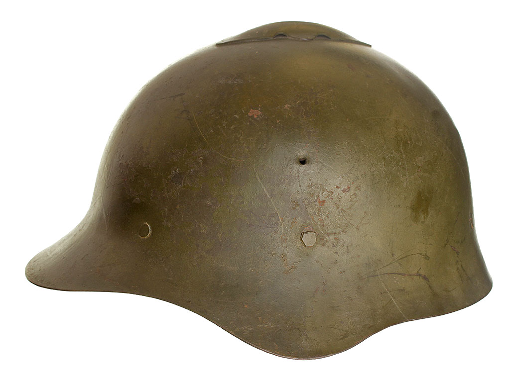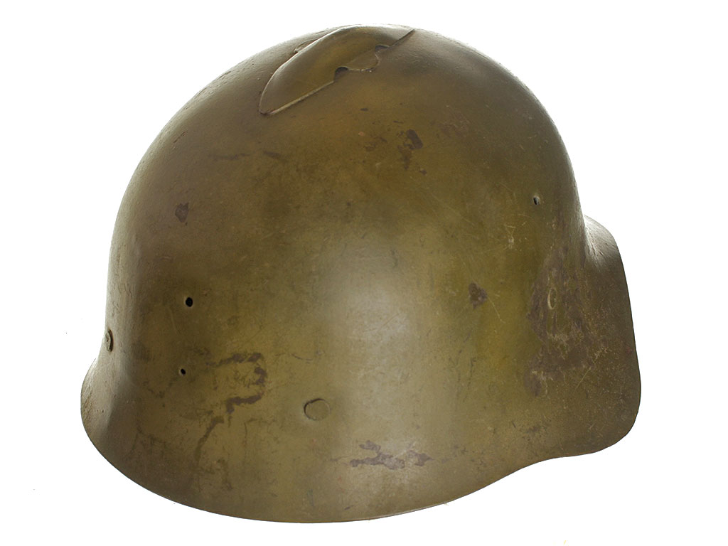 Стальной шлем образца 1936 года (СШ-36) с переставленным во время Второй мировой войны в заводских условиях подшлемником. Практически полностью сохранилось красочное покрытие, брезентовый подбородочный ремешок. Очень хорошее состояние.