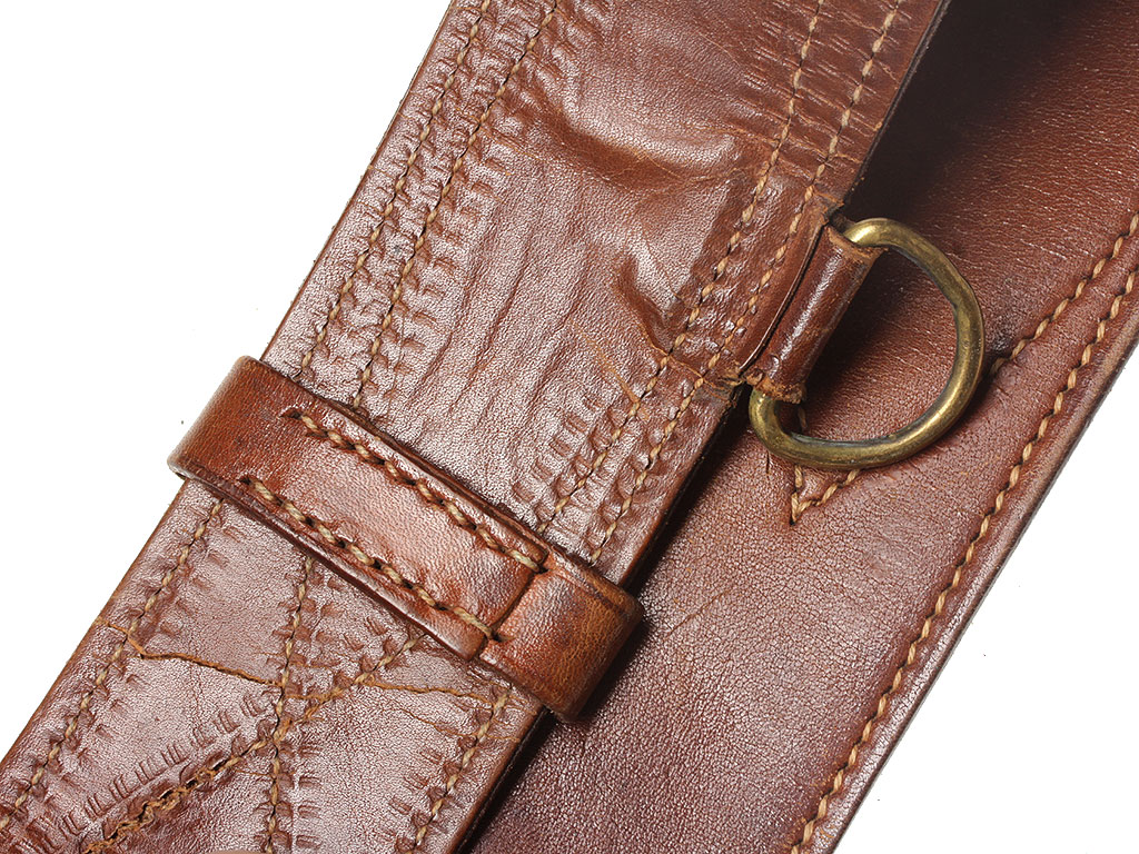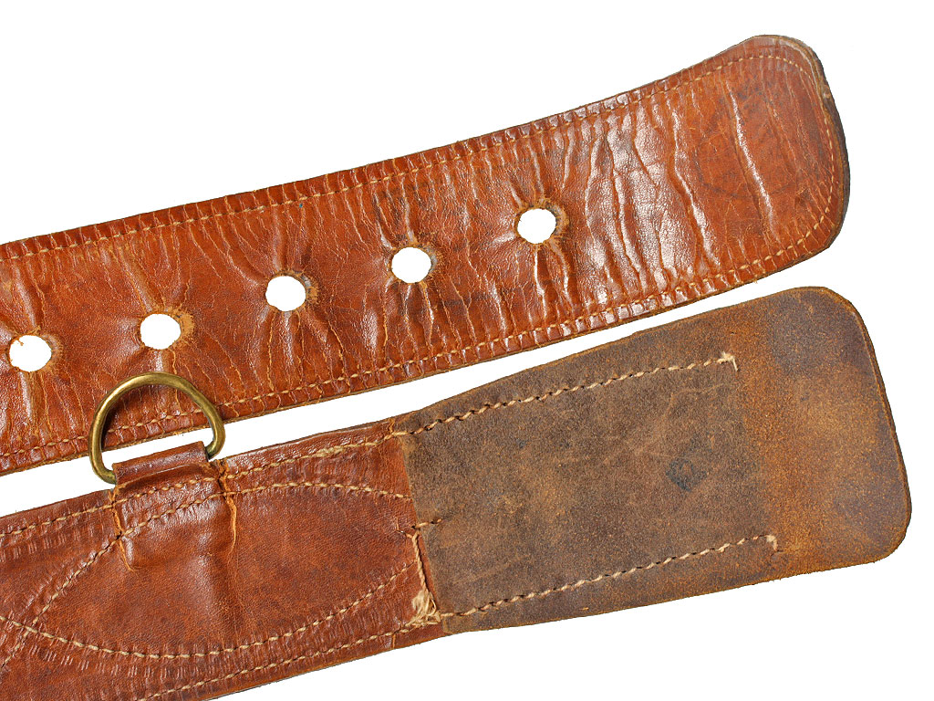 Ремень повседневный командного и начальствующего состава РККА, изготовленный в конце 1930-х годов. Темно-коричневая плотная кожа, с двумя латунными D-кольцами под портупею и латунной прорезной пряжкой с изображением пятиконечной звезды.