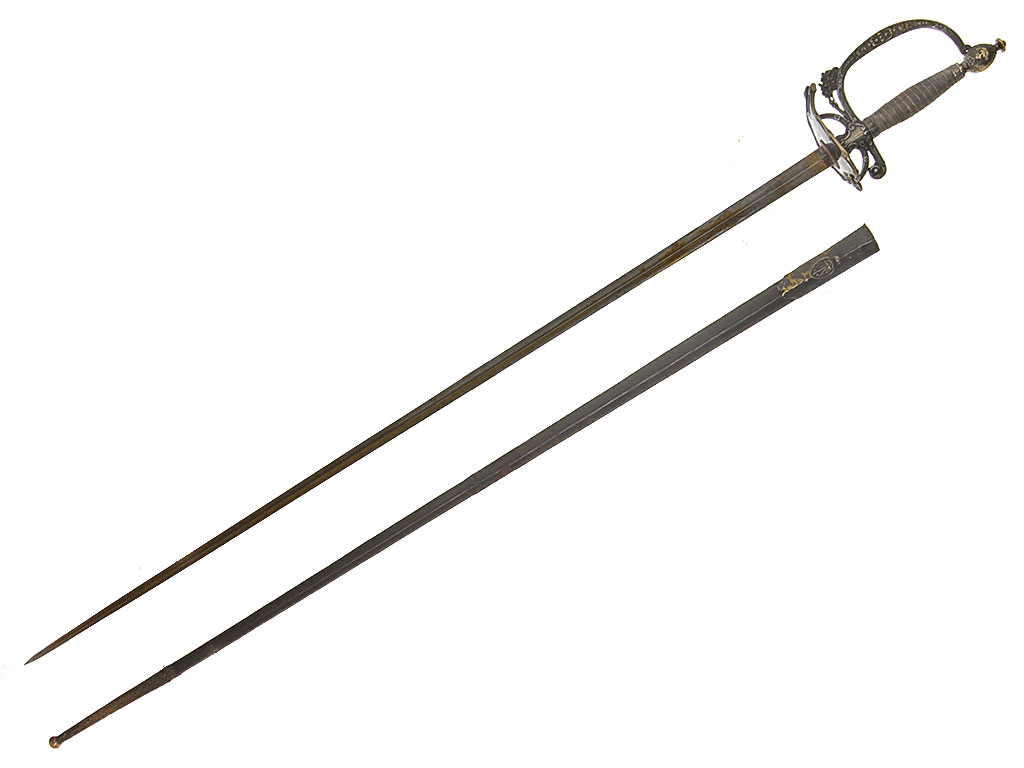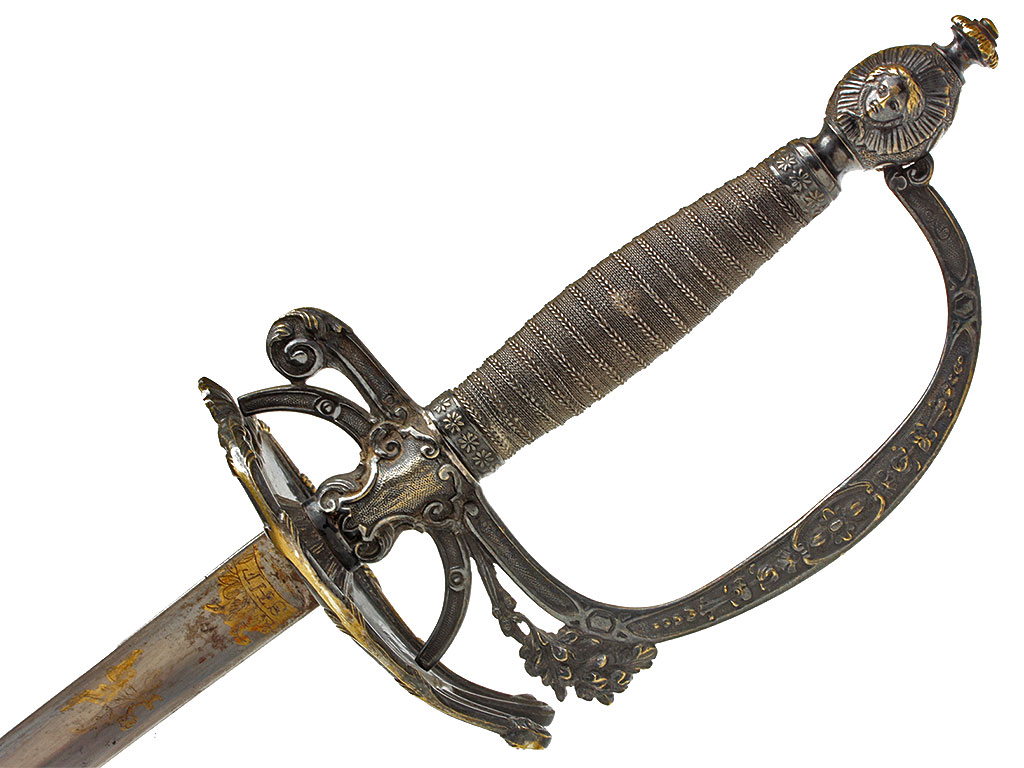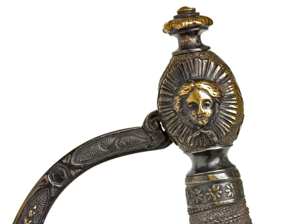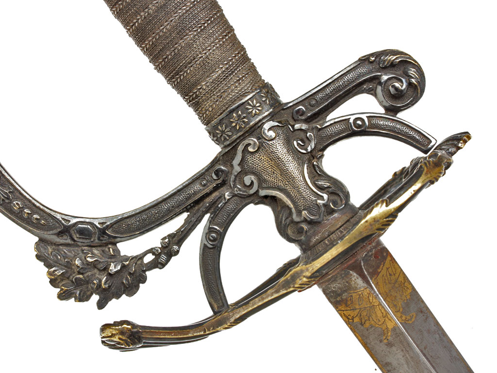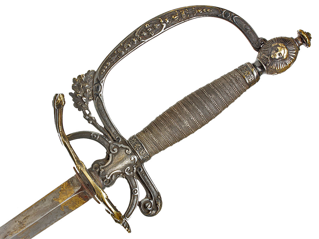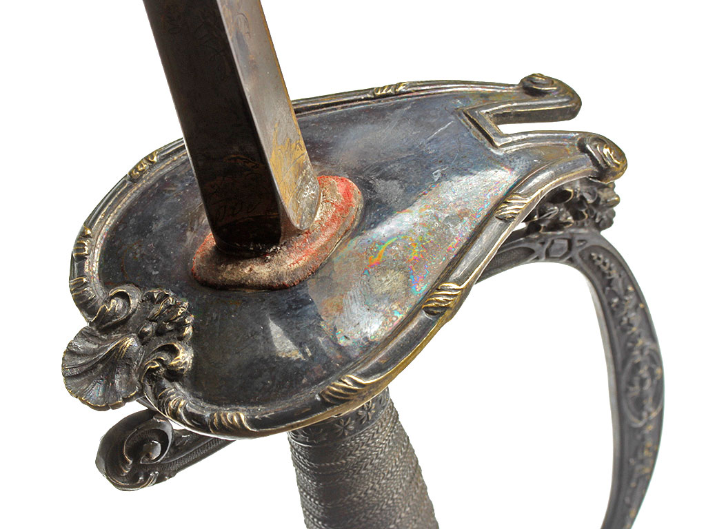 Эфес латунный, полностью посеребренный, состоит из рукояти и гарды. Рукоять деревянная, сплошь перевитая серебряной проволокой. Гарда состоит из сердцевидной чашки и крестовины, переходящей в дужку, верхний конец которой скреплен с головкой. Дужка украшена растительным орнаментом, в нижней части имеет дополнительный элемент в виде дубовой ветви. Головка овальная, украшена растительным орнаментом и изображением солнца.