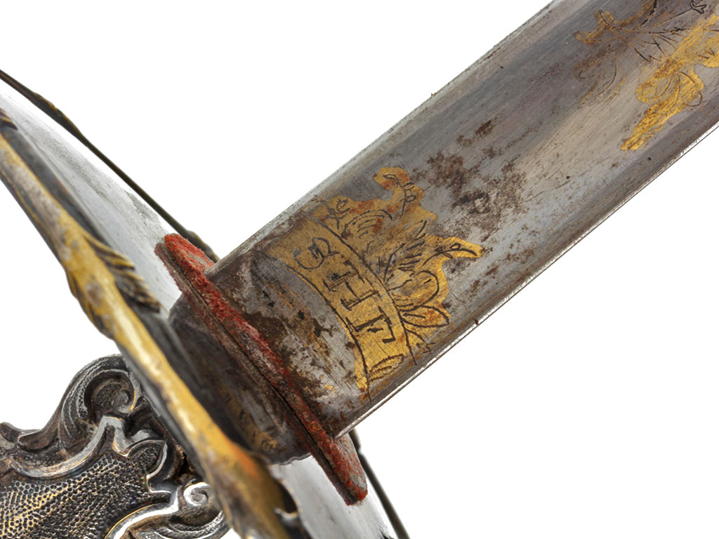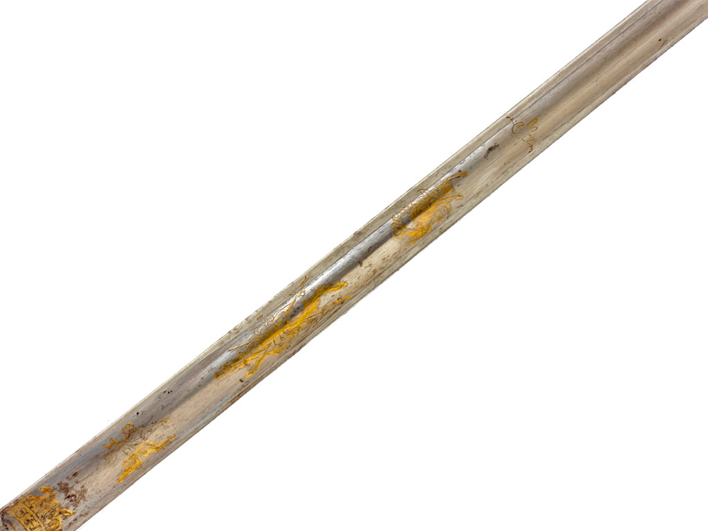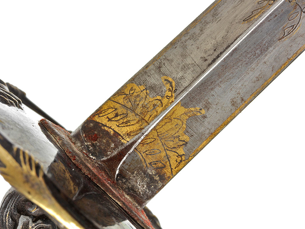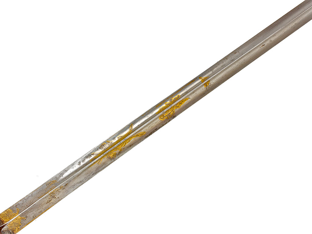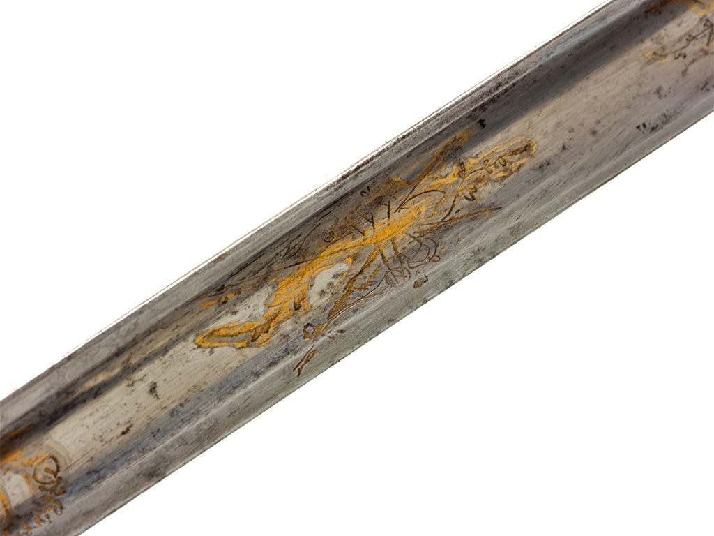 Клинок классический прямой, трехгранного сечения. У основания клинка имеется монограмма изготовителя "SHF". Со всех трех сторон в верхней четверти украшен гравированными виньетками с растительным орнаментом. Гравировка имеет следы золочения.