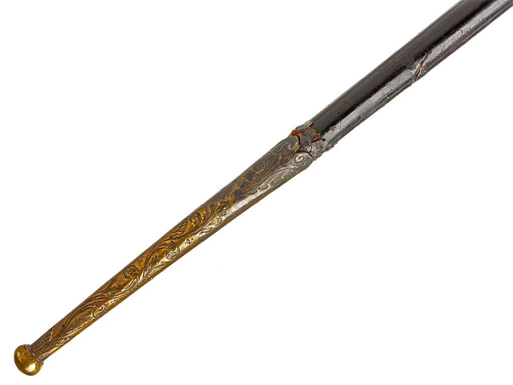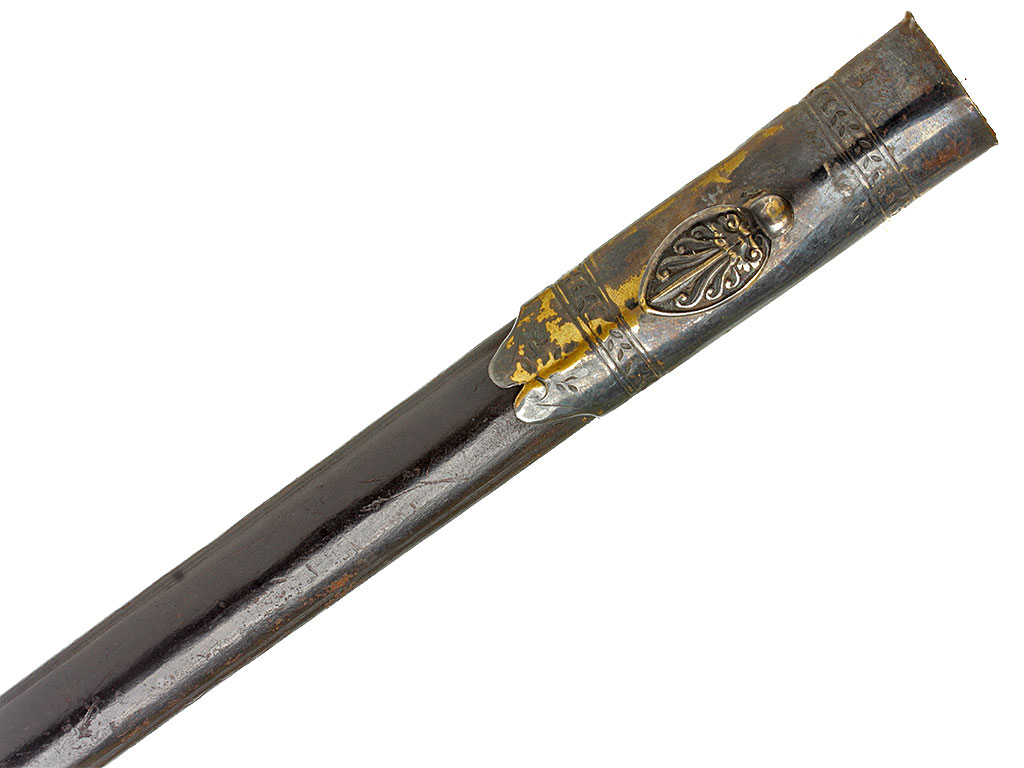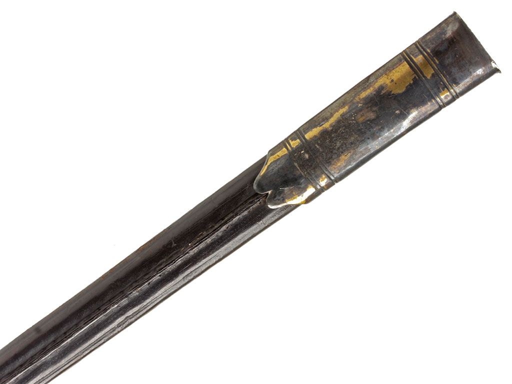 Ножны из плотной черной кожи, с латунным посеребренным прибором, состоящим из устья с лепестком для крепления к портупее и наконечника. Когда-то треснули посередине, имеют следы старого ремонта.