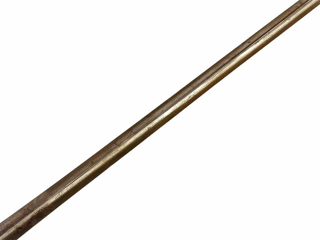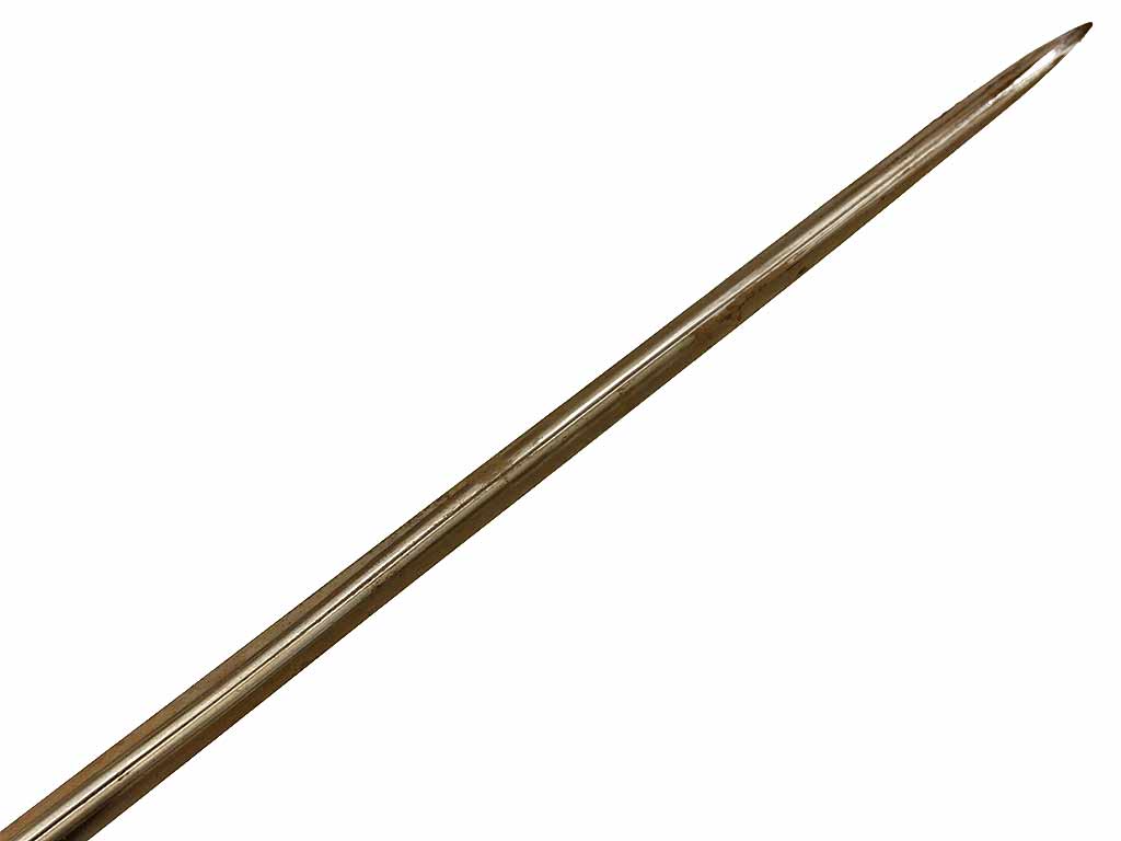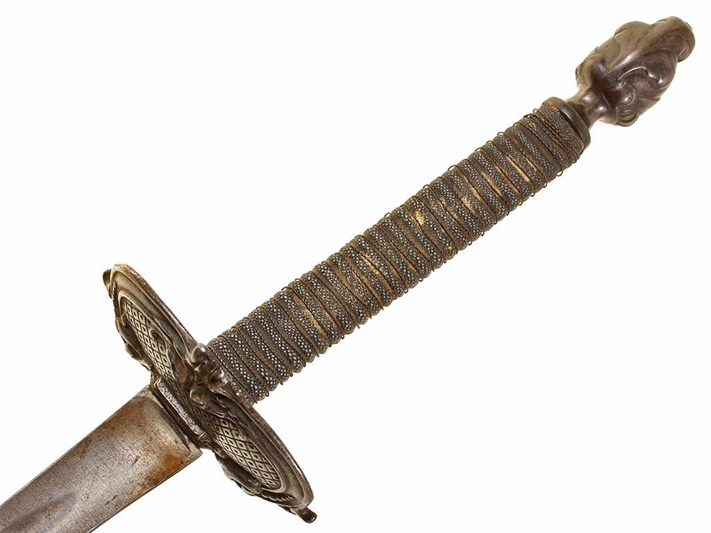 Дворянская рапира второй половины XVIII века. Клинок без клейм, треугольного сечения, ничем не украшен: очень прочный и гибкий. Рукоять деревянная, обтянутая шагреневой кожей, перевитая по желобкам витой латунной проволокой. Необходимо отметить, что рукоять очень удобна для удержания в руке: длинная, под крупную руку, почти четырехгранного сечения. Прибор изготовлен из стали. Навершие изготовлено в виде рыцарского шлема, дужка гарды изначально отсутствует: возможно, владельцу было удобнее фехтовать без нее. Ножны из плотной черной кожи, со стальным прибором.