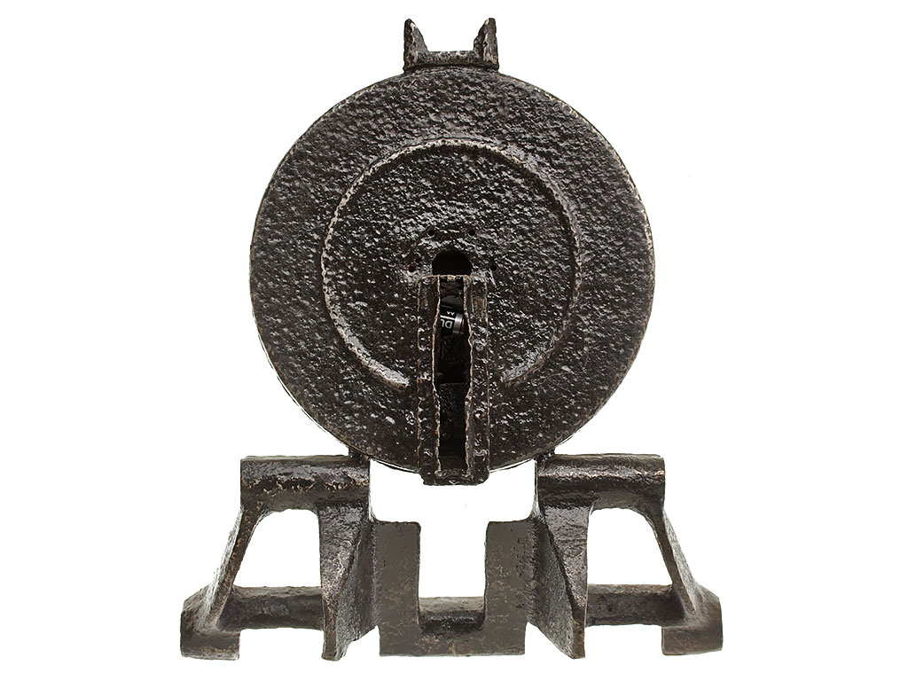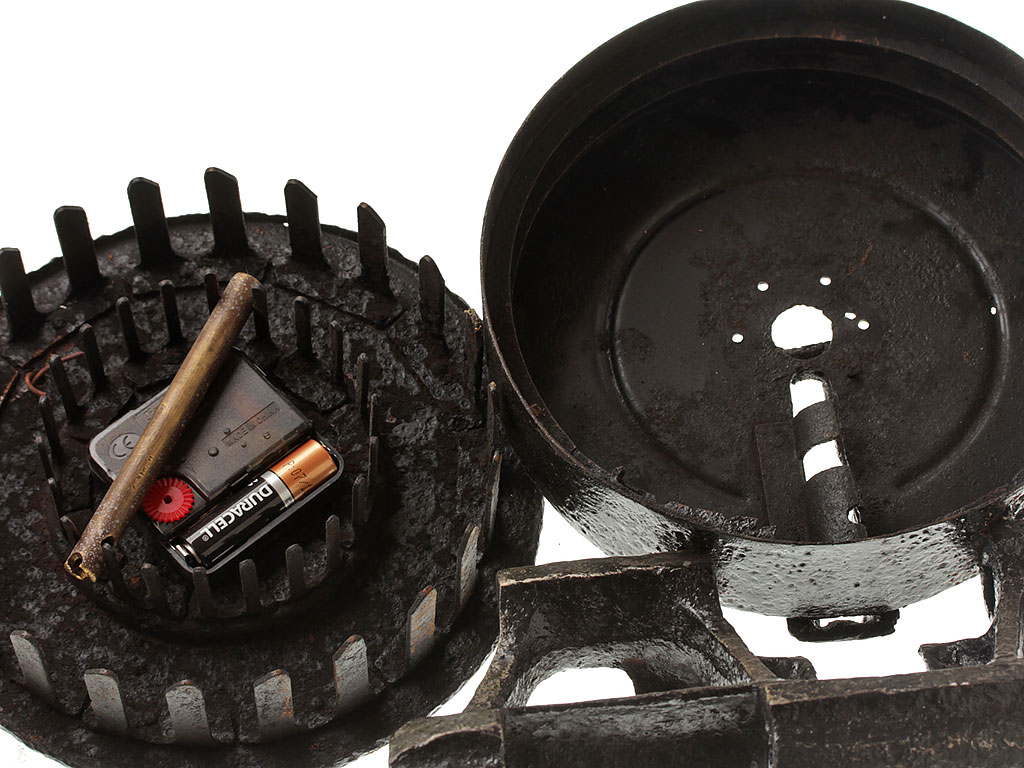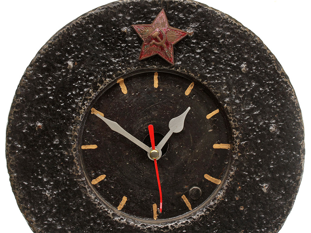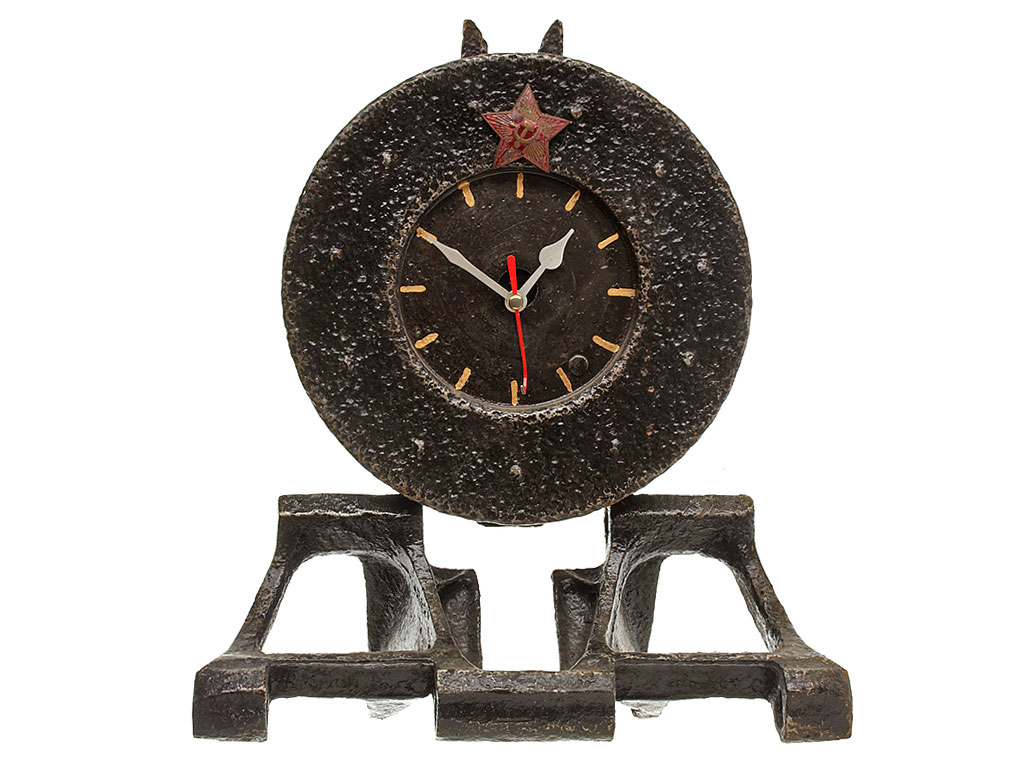Настольные часы с кварцевым механизмом, корпус которых изготовлен из диска к танковому пулемету Дегтярева обр. 1927 года (ДТ-27), помещенного на подставку из трака к немецкому танку Т-1.